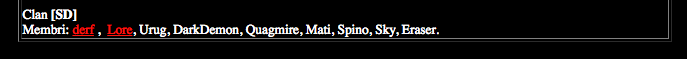 Un clan indica un gruppo di giocatori che si uniscono insieme formando una squadra. Questo squadra partecipa a tornei o semplici scontri diretti contro altre squadre. La rappresentanza delle squadre italiane e’ qui di seguito elencata. Sono inseriti i clans che si sono registrati mandandomi un e.mail contenente: