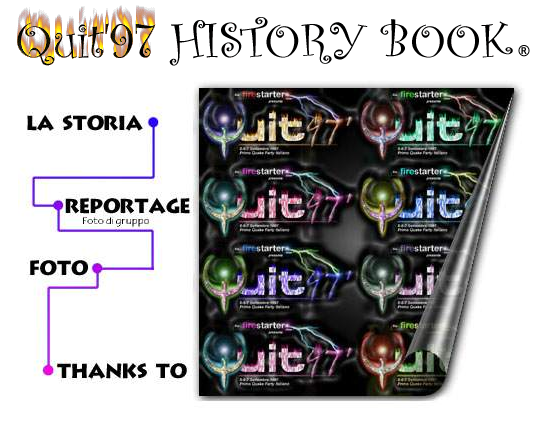 Benvenuti nel sito ufficiale di Quake Italia ’97, prima manifestazione nazionale di multiplaying Quake. La manifestazione si e’ svolta il 6-7 Settembre (non stop, 33 ore continuate dalle 15:00 di Sabato a mezzanotte ed oltre di Domenica) nei locali del Virtual Pub, in La Spezia. Nelle interminabili ore trascorse i Quakers piu’ fanatici d’Italia si sono scontrati senza tregua al gioco che tutti loro amano. Un’occasione unica d’incontro tra vari Clans e tra tutti coloro che finora si sono incontrati solo sulla Rete.