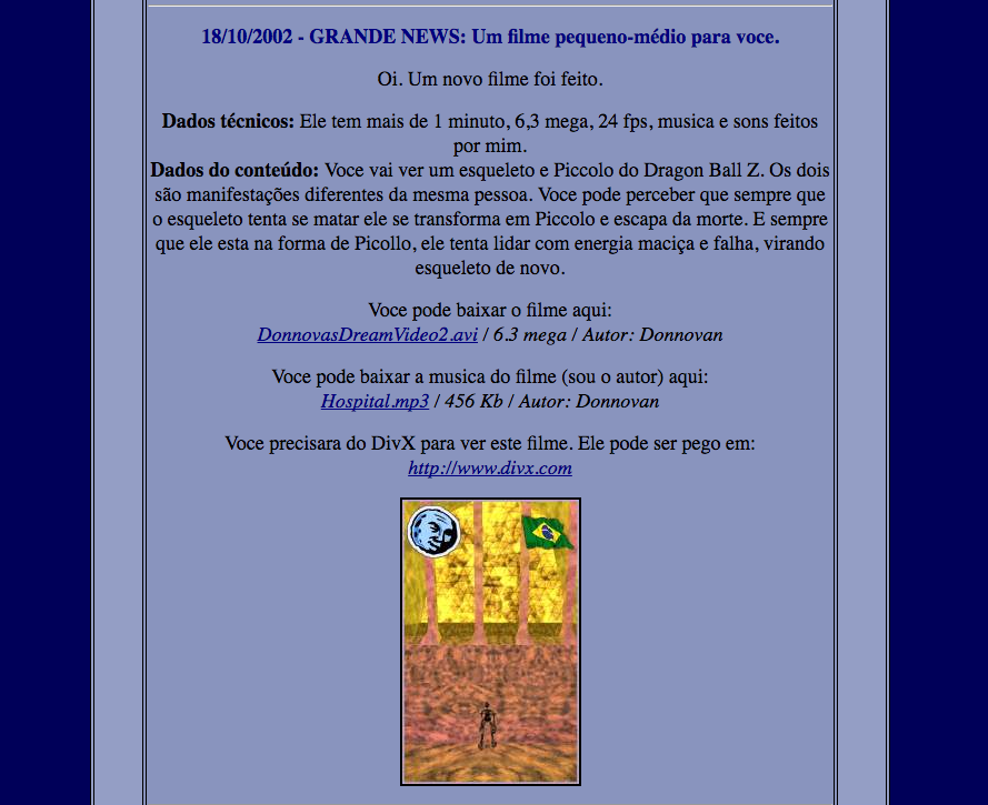 I’m still Donnovan, but now my life changed a bit, I’m happy, and my movies will change too. Seeing A Warrior’s Life again I sayd “God! I need to change this movie.” So I decided now. I will cut some scenes here, some there. Make new animations, change the Julios skills picture (remember that? logic skills – 0, Mathematics – 0, etc…), make the movie more easy to watch, make it more appelative and may be make the Ill Robinson girl friend enjoy it.