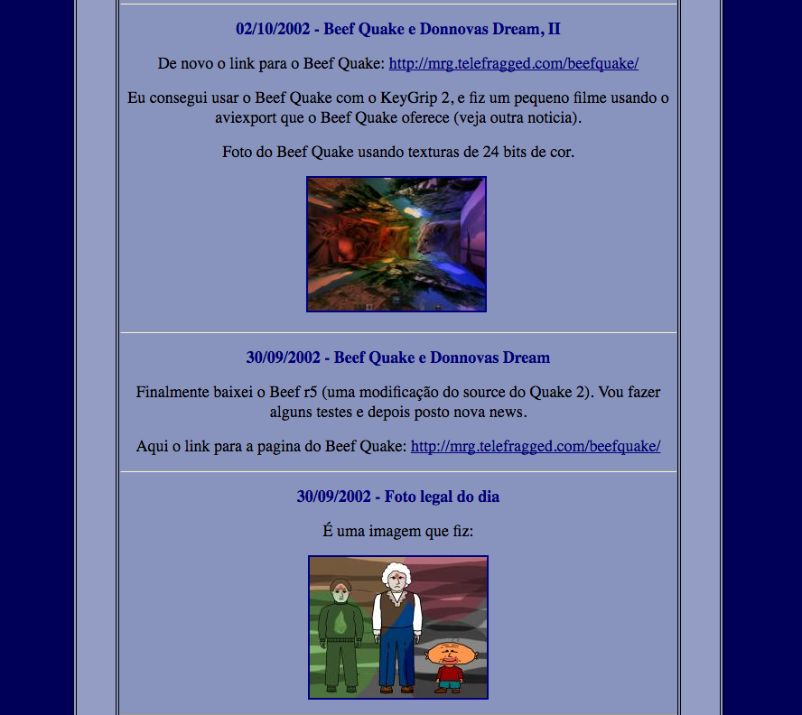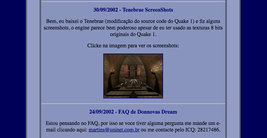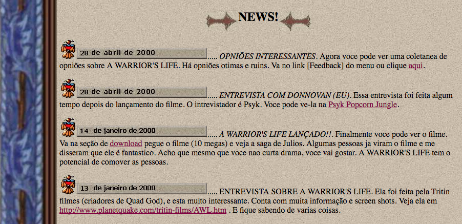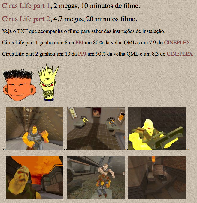 Meu nick é Donnovan, ja fiz três filmes desse tipo, ambos para o engine do Quake 2. São eles: Cirus Life 1, Cirus Life 2 e A Warrior´s Life. Nos próximos updates desta pagina colocarei mais informação sobre esses 3 filmes.