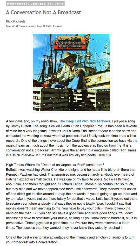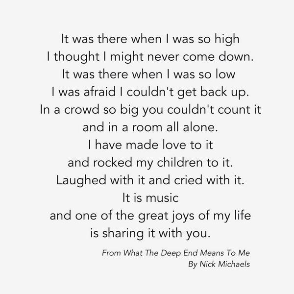 A legendary broadcaster, who I have been listening to since I was in my first job, late night dishwasher at a fine dining club in Chicago, passed away this past weekend. Nick Michaels introduced me to a ton of music that I would never have heard otherwise, and with his contextualization and thoughtful approach and delivery, made that awesome classic rock sound even better. I have no doubt that the spirit lives on, in the Deep End.