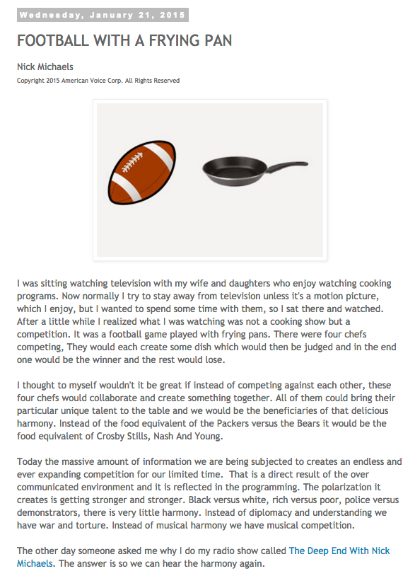 Three years ago when we signed-on a new talk FM in coastal Georgia, the client let me choose the call letters. And Nick’s voice assured that, “When you need to know, WBQO.” But only until 7:00 pm each weeknight. “Enough talk.” We repurposed his 4-hour weekend music show to 70 hours of night time programming; and “The Deep End” remains the most popular programming on the station. He got mail from listeners who thought he was local.