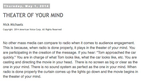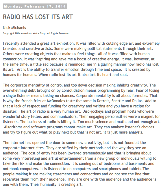 Nick REALLY got it: “When great radio is your main focus the audience and the advertising money will find you. When money is your main focus, the audience and the advertising money will go looking for great radio.”
