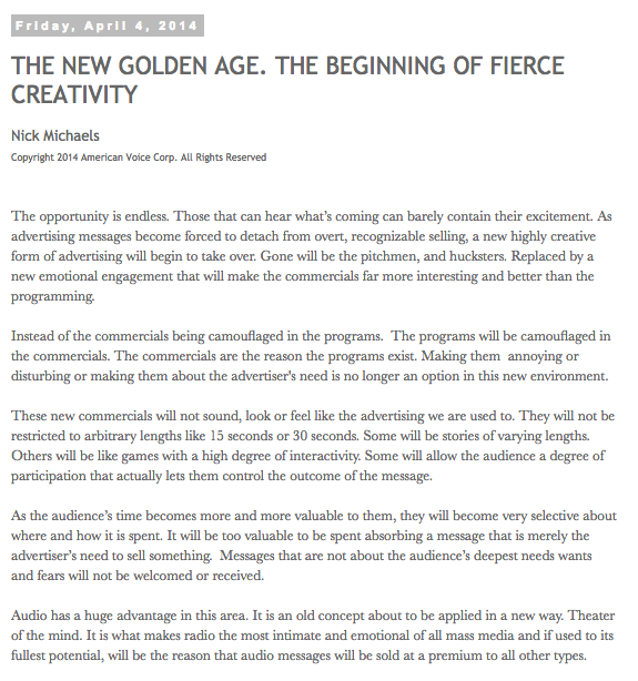 Nick REALLY got it: “When great radio is your main focus the audience and the advertising money will find you. When money is your main focus, the audience and the advertising money will go looking for great radio.”
