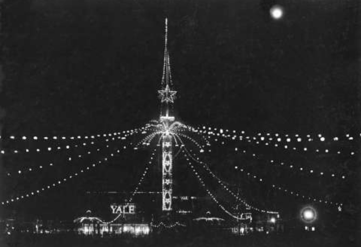 Celebrating Yale’s bicentennial with lights strung on the New Haven Green, photo courtesy of Yale Library