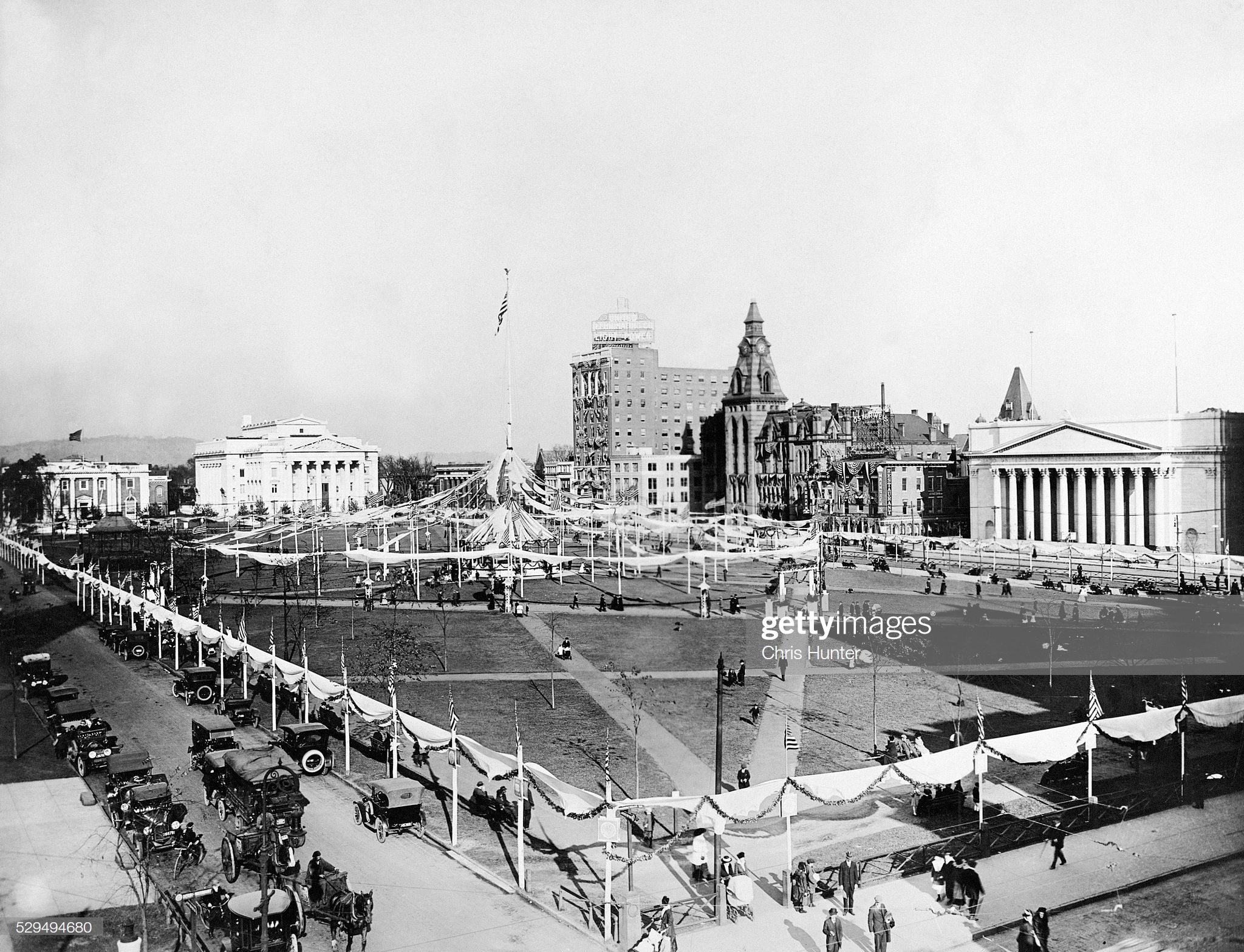 An overview of New Haven Green that is decorated for the bicentennial celebration of the founding of Yale University. (Photo by Schenectady Museum; Hall of Electrical History Foundation/CORBIS/Corbis via Getty Images)