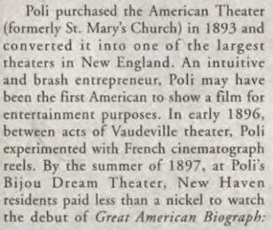 “With the Shubert Theater and the Roger Sherman both fronting on College Street, this block became the core of the New Haven theater area. In 1929 the Crown Theater was constructed around the corner on Crown Street and in 1933 the entrance to the Hyperion was moved from Chapel to College Street so that it could compete more readily with the Roger Sherman. The interior remodelling of the Hyperion emphasized the screen over the stage. Part of the reason behind this costly renovation effort was the growing popularity of movies, but also it was the result of competition.” – Chapel Street Historic District nomination form