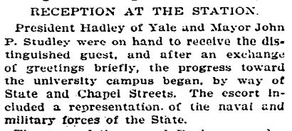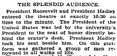 Mark Twain regarding Arthur Twining Hadley, then president of Yale: Now there’s a very remarkable man. I’ll never forget what he said about me, the day I was invited by Yale to come up and be given a degree. The great platform was filled with men to be honored. Our writer group was put somewhat upstage. Quite a few of the boys were there, Howells, Cable and other writers I knew; and as each was called down to receive his degree, President Hadley in a few words gave a most wonderful summing up of the character and achievements of each. As each came back, he’d whisper to me: ‘Sam, what will Hadley say about you and your dark and checkered career?’ They made me so nervous I couldn’t sit still. At last my turn came. Downstage I walked. When an official called the name of Samuel Clemens, the New Haven boys all rose to their feet and made quite a noise. When at last it was over, Hadley declared: ‘After this demonstration, anything I could say would be useless.’ Hooded and honored I came back without knowing what Hadley had meant to say. I was disappointed and so were the boys. But one of them told me, at the end of the ceremonies that day: ‘Sam, every speech that Hadley made was written ahead in a little book, which is in the hands of his secretary, that young woman over there.’ Eagerly I went to her and never have I flattered a female as I did that young woman that day. At last she let me see the book. As I turned the pages, every speech exactly as it had been spoken was there. Faster I turned them with feverish hands! And on the last page I read these lines: ‘Samuel Clemens. After this demonstration anything I could say would be useless.’ – quoted in The Bridge by Ernest Poole, p. 172.