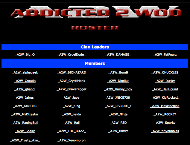 - Clan recruiting will be done by a select few. If you have someone you think would be a good candidate for membership, contact _A2W_Big_O, _A2W_CruelDude_, _A2W_DAMAGE_, or _A2W_FstFngrz.