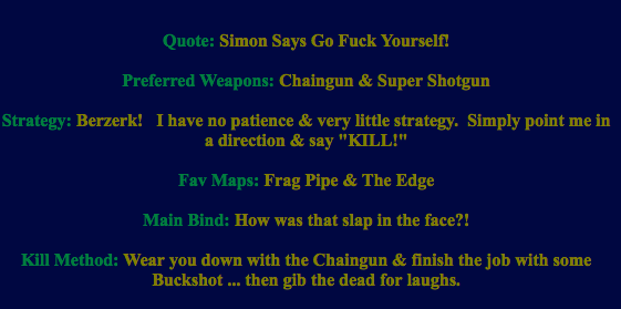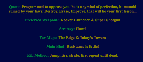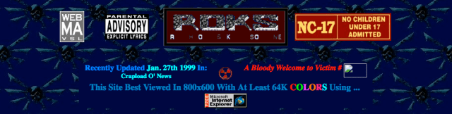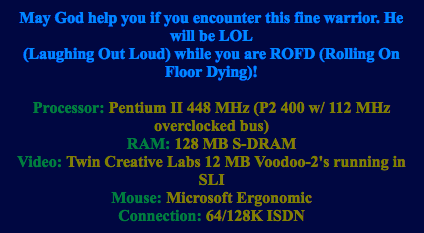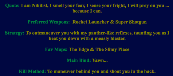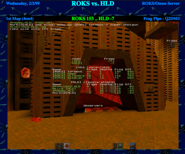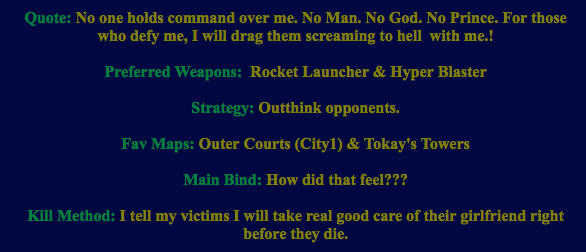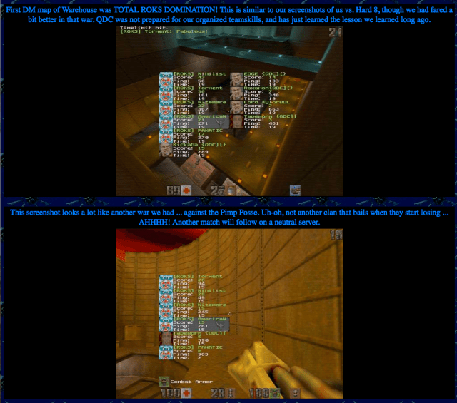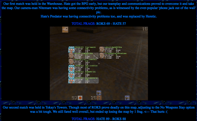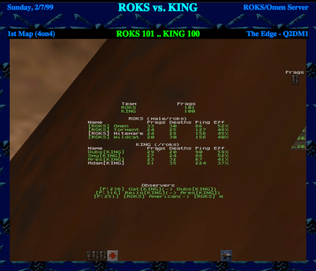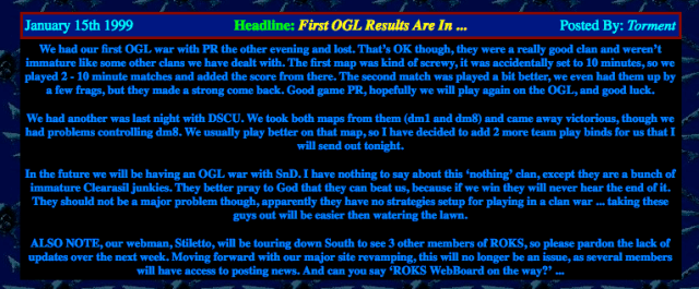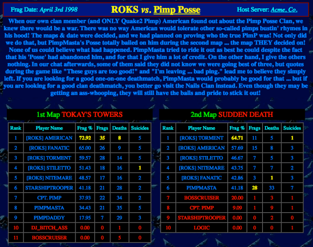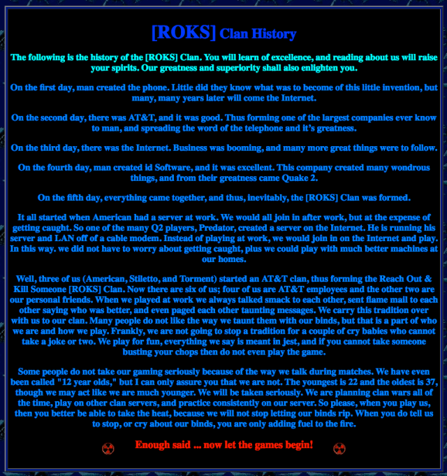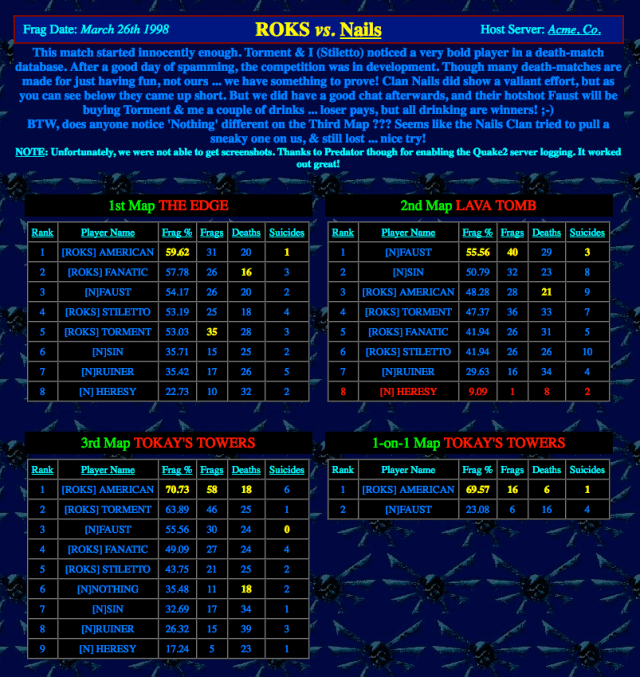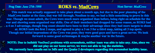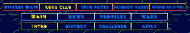 ROKS started on March 26, 1998. We have had many wars, over 30 were played and we only lost 3. All of us have become the best of friends in the process. We have made many enemies in the Q2 world and made some valuable friends, and none of us regret doing so. So if any clan out there still has a problem with us, then please direct your browser to the NM website and click on challenge, we will be more then happy to kick your ass. My LAN party is still on for the last weekend in March, and I recently realized that the LAN party will be held on the ROKS clan 1 year anniversary. I did not even plan it that way, and yes, the entire ROKS clan is still going to be there, and I might even be picking up some NM members as well.