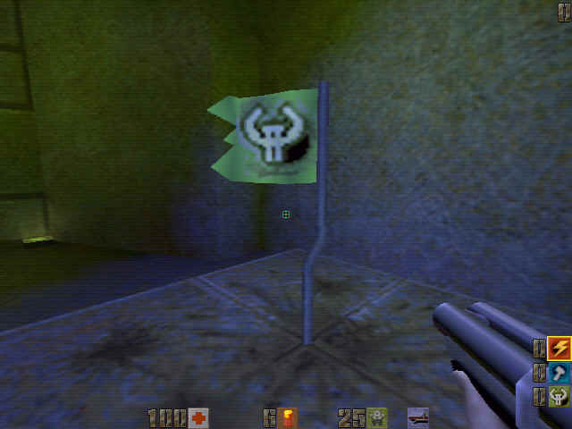 KOWF (Kill the One With the Flag) is almost finished. I still have to create the scoreboards and HUD designs for 2 and 3 team playermode. HUD design is a problem. KOWF is using 4 extra items on the HUD for displaying the time you hold the flag. I probably have to get rid of some extra stuff to display all information. I can on only use 32 items in the HUD and standard items (health, armor etc) is taking 15 already, leaving me 17 for the mod. Each icon (team red, blue and green icons) uses 1 of those, 3 in total for team logos. (In the mod these are called STATS) If I want to display the total time for each team at the left of the icon (like the name of the flagcarrier in (3T)CTF) if will use another 3 Stats. 11 left… 1 for the name of player that you can be chasing, 1 for possible flashing icon when you hold the flag. # of frags, # of player, your rank etc. These take Stats like I take cookies.