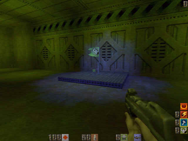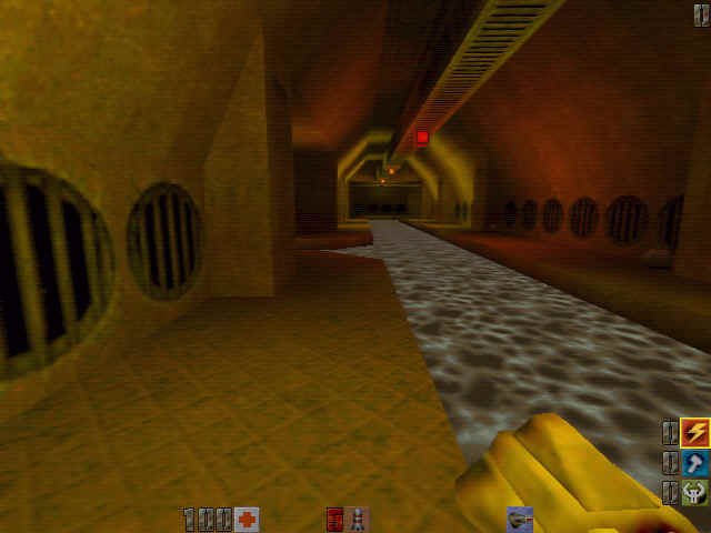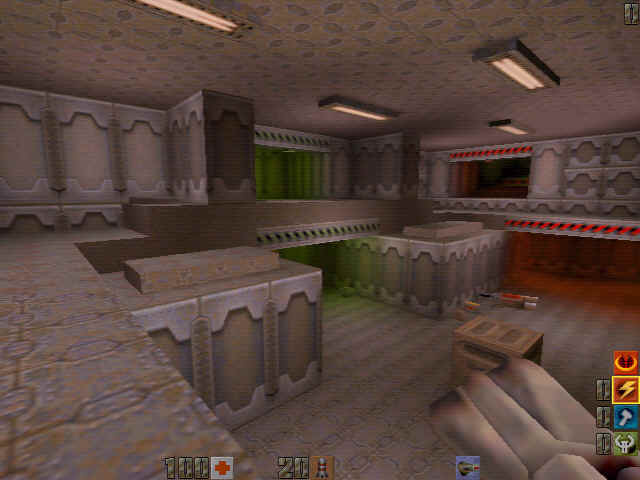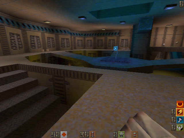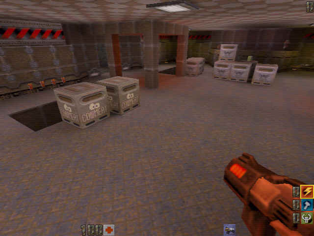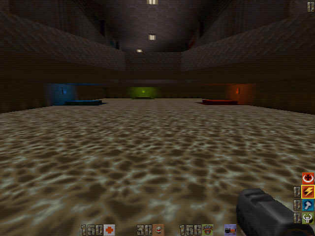 The second map consists of underground tunnels leading to the separate bases…and a lot of water. There’s one outdoor crossroads area, and an alternate teleporter room that leads to all three bases. One nice touch in the crossroads area is a BFG that’s off-limits…or is it?