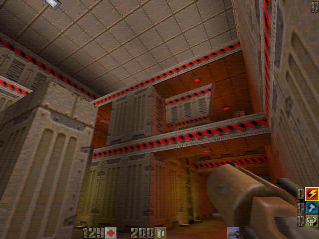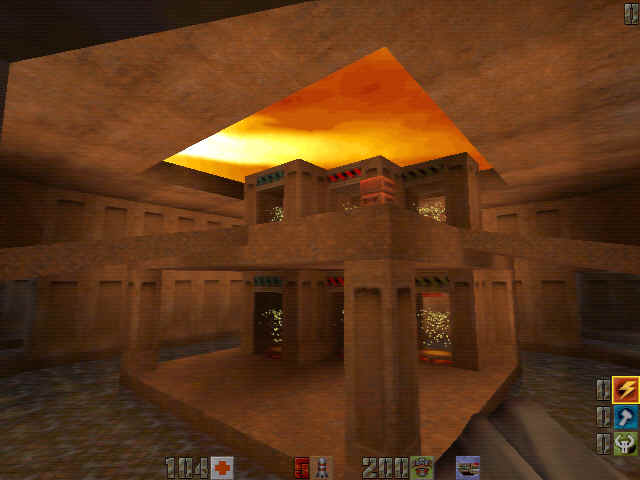 Lord’s Cave has three indoor bases, each leading to a large outdoor area. Each base can only be accessed via a small crossroads area with teleporters to each base. There’s a BFG above the crossroads, but it’s well-protected by a security grid…hmmm, could there be a way to get through it? ;-)