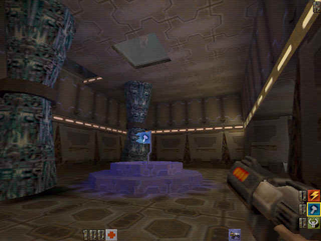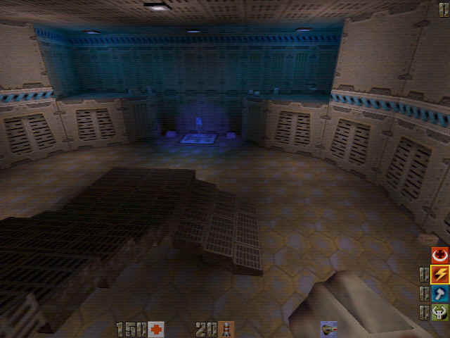 The first map in the 3TCTF episode has a small flag room flanked by two similarly sized rooms for the defense to patrol. Both lead to two large upper rooms, which in turn lead to the crossroads area. The crossroads has clear markings indicating the direction to each base, and also has teleporters to each upper base as well.