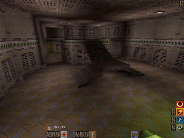Death Wish is a nice, tight indoor CTF map with 2 distinct routes to each base meeting at one small crossroads. There’s a basic lower level route to each base, as well as an upper level, allowing flag carriers to get in and get out quickly, similar to the layout in Q2CTF3 “The Smelter”.