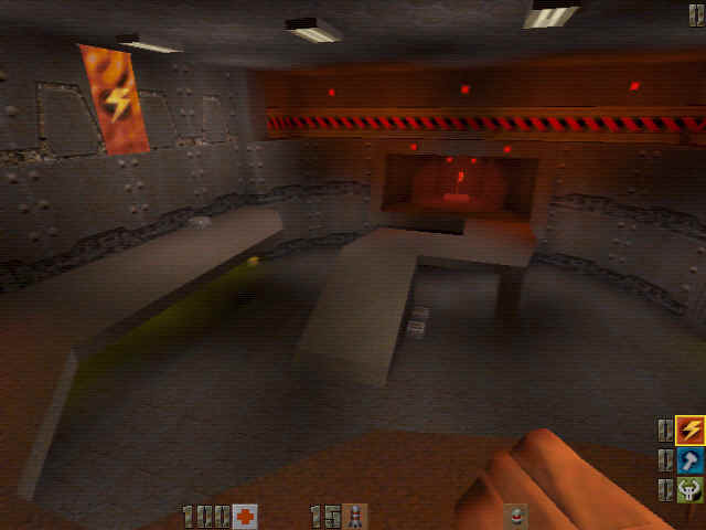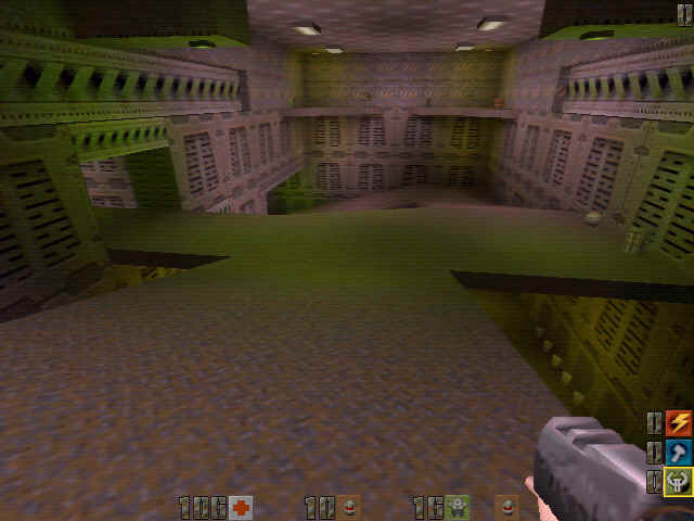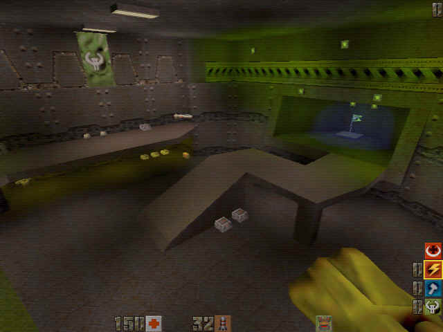 The last level in the episode, Final Fight is well done and has a “T”-based format connecting the bases. There’s one main route to each base, but there are several levels available, allowing you to take either the high or low road to the enemy flag. The flag rooms are of a medium size, and offer many options to defensive players.