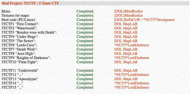 Final version of the game will contain: A total of 8 maps. 7 of them are designed by DOL’s MapLAB. Map ‘3tctf6, Lord’s cave’ is made by iQ.Lord Darkness. There will be a win32 and a Linux version of the mod. Skins and textures are made by [DOL]MissRookie. Programming is done by DCB-SuperCow! and porting of the mod to a Linux version is done by *NuT5*Dessignator and Grizzly.