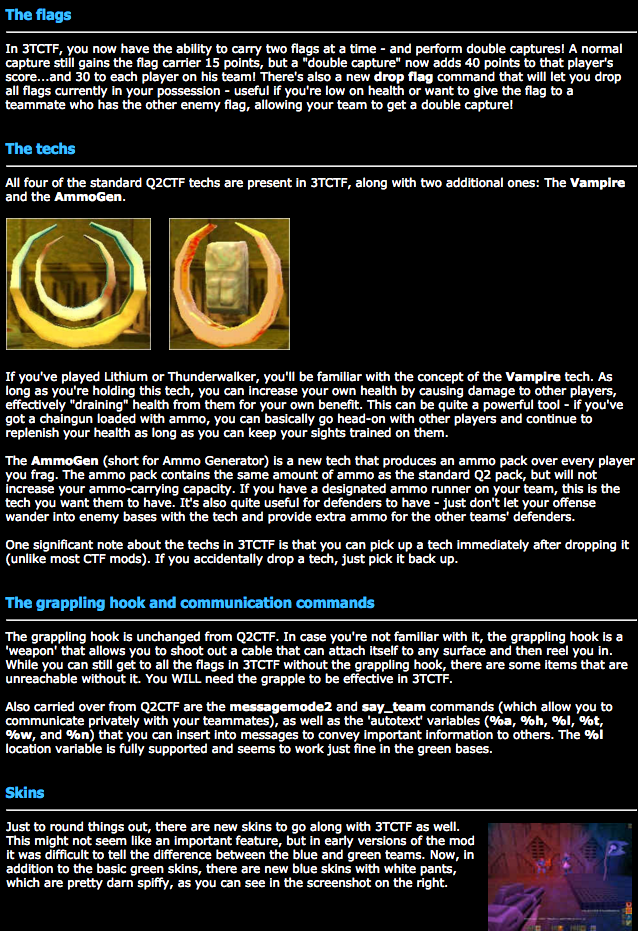 The Bottom Line: 3TCTF is a quality Q2 mod offering an option to Q2CTF fans looking for something new. If you can find a server with enough players, you won’t be disappointed.