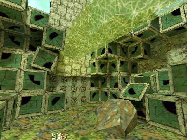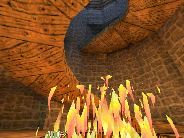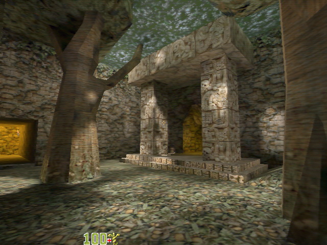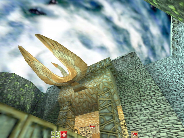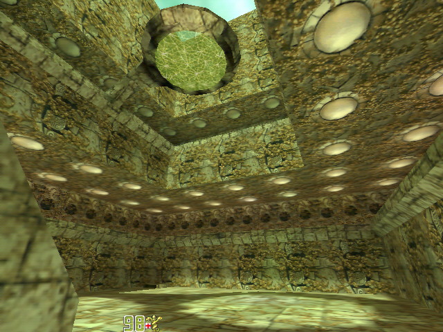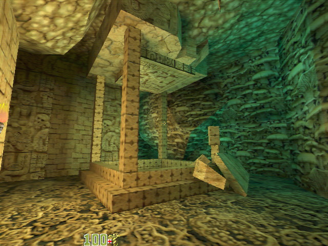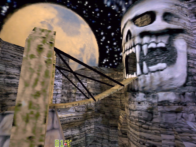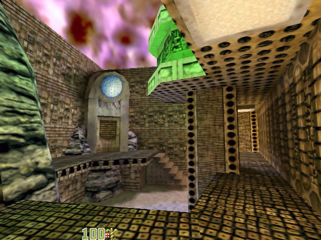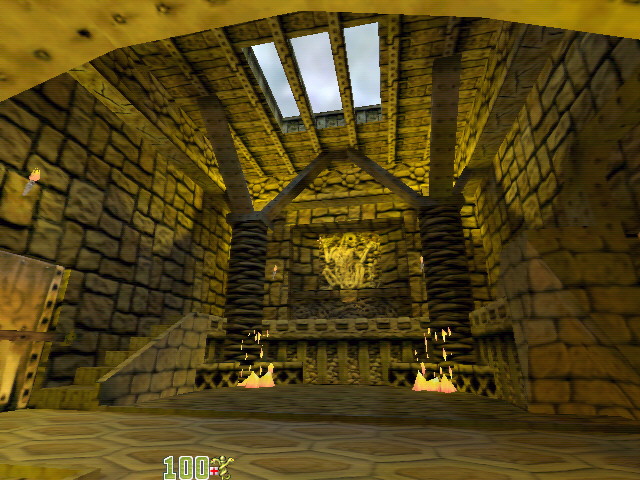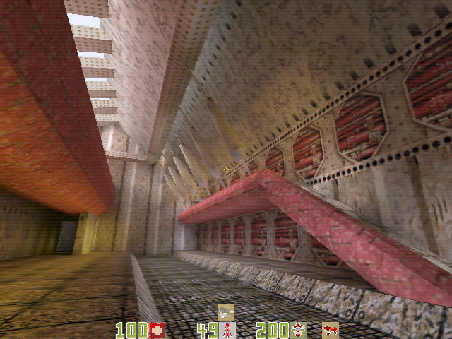 I’m sure you’re thinking, “Well, I’m sure you can create some really cool things with brushes, but I bet it slows the game WAY down!”. Sure, that can happen. But if you use fancy brushwork in combination with more simple forms, your r_speeds will be just fine. Think about it… a few staircases can give you hundreds of triangles for Quake to draw. Stairs have ALOT of different planes, and they cut up the walls next to them. Now, would you rather have an awesome brush model in the room and a simple ramp, or nothing cool in the room and yet-another staircase?