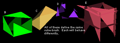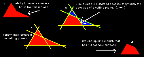 Brushes are of course the building blocks that the level is made from. They are always convex because of the way they are created. Imagine a world made of styro-foam that goes forever in all directions. To make a brush, you make infinitely large slices in the foam, and what is left over from that whole universe of styro-foam is your brush. You can imagine how easy it would be to forget a slice or two and end up with a brush that goes off into infinity. Its also obvious that you cant create a single brush that has a dent or “concave” surface on it, because each slice you make goes forever… you’d always chop-off parts of the brush that would have caused it to have the concave shape in the first place. In the old days of Quake1, brushes had to have 16 or less “slices” to compile, but now you can find QBSPs that have the ability to create brushes with 256 slices, and QBSP3 seems to allow alot of slices too.