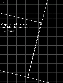 The numbers within the parentheses are the X-Y-Z coordinates for the three points of a cutting plane. Notice that all vertices (points that define each “slice” or “plane”) end up being integers (no decimals) in the .map format. This is what causes alot of the errors and gaps and mis-alignments in your Quake maps. The problem is that when you rotate a brush to anything but 90 degree angles, it is almost guaranteed that most or all of your cutting planes will contain decimal values, which will be truncated when you save as .map to compile. This causes shapes to change slightly…