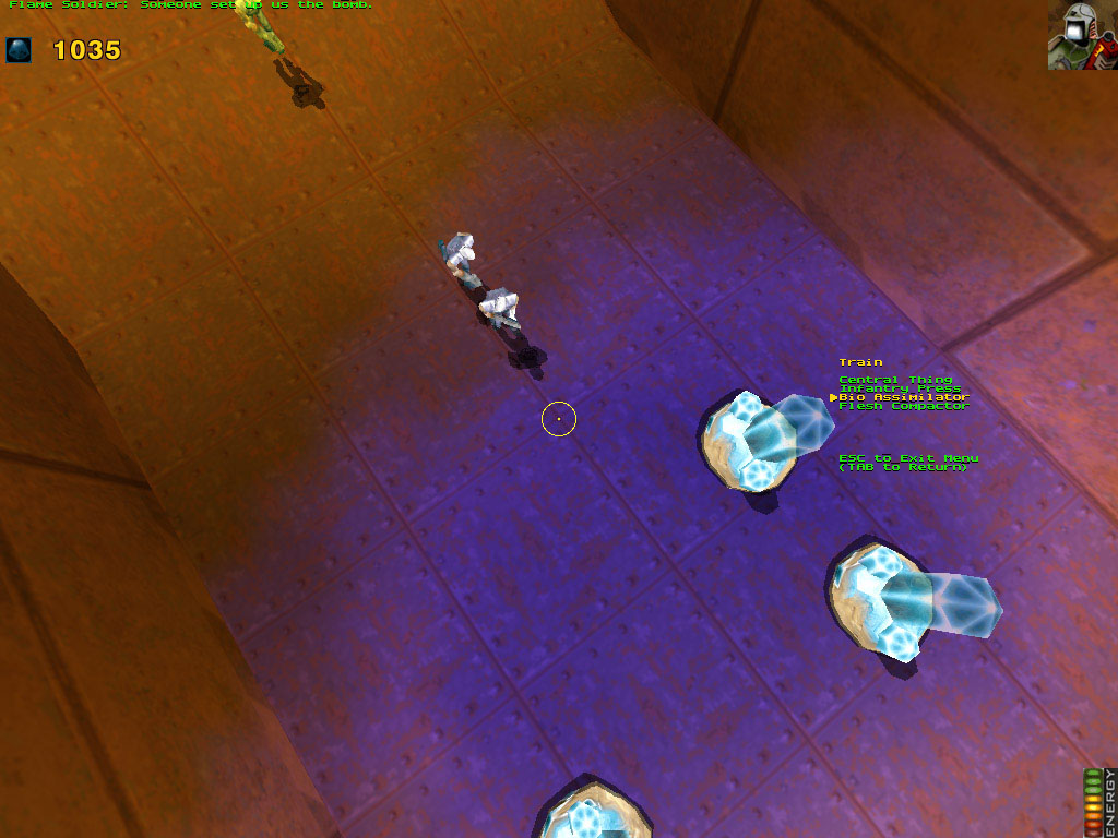 You have probably noticed by now that you start with only one unit. This unit is a flyer, one of the most basic units, it’s not very tough, but it’s useful. The flyer can build machines and harvest resources. In QandC a machine is like the buildings of other RTS games. Each one does a different task, but most are concerned with the production of new units. Try clicking once on the flyer, and then once on a patch of ground. Your minion should wander over to where you clicked.