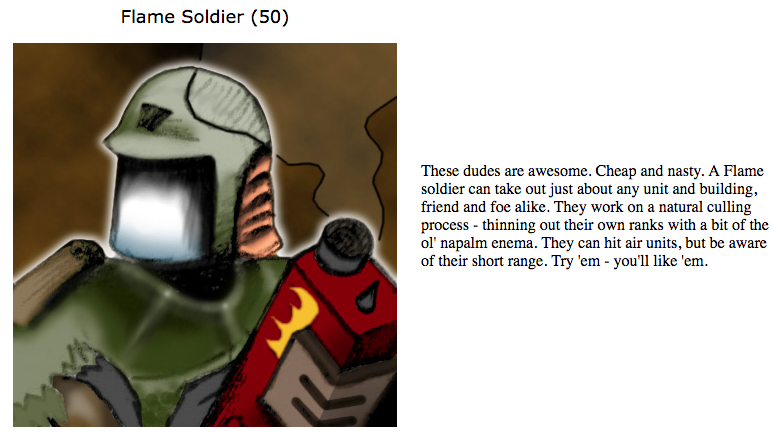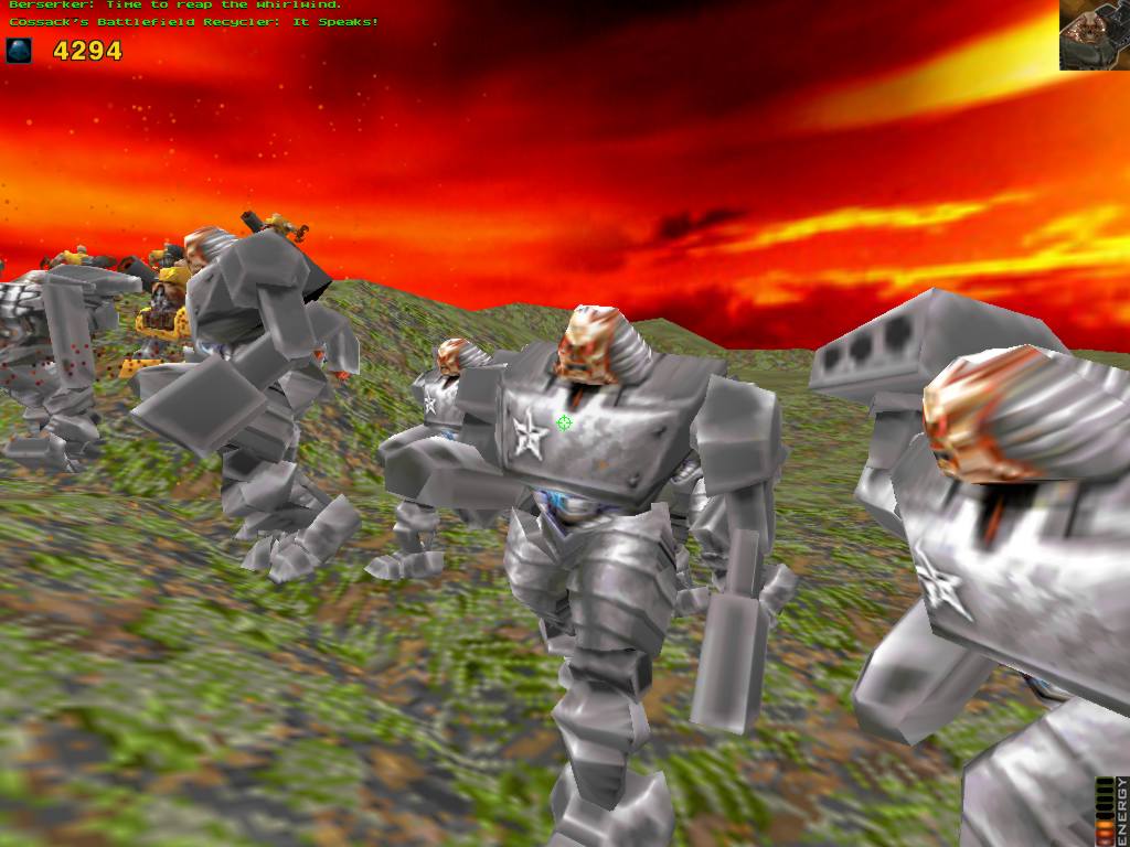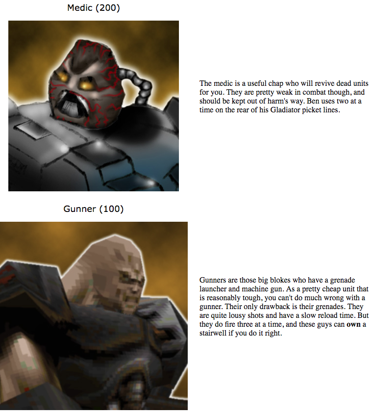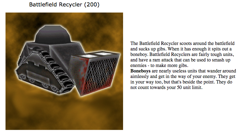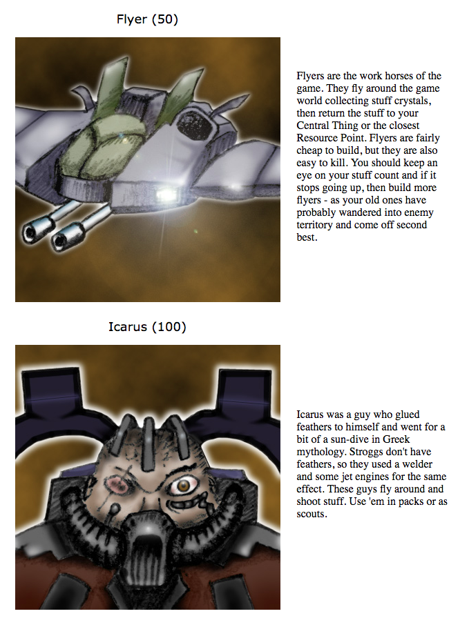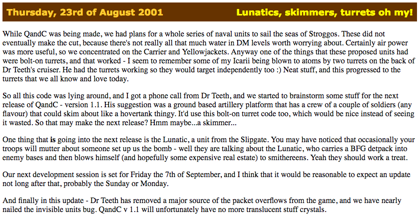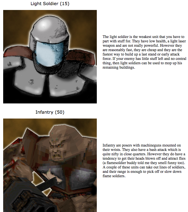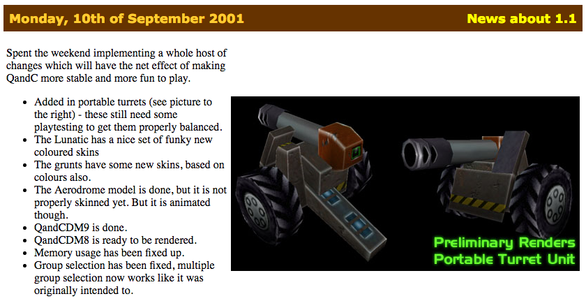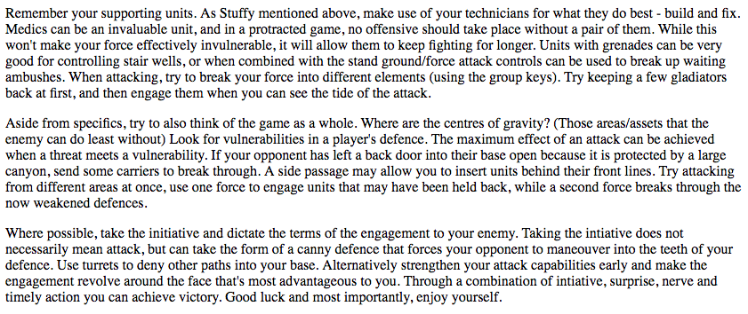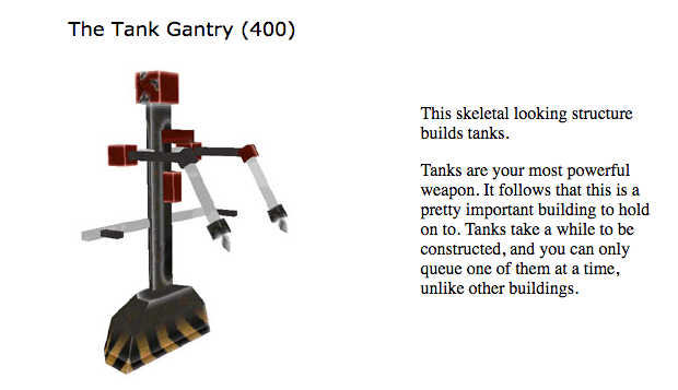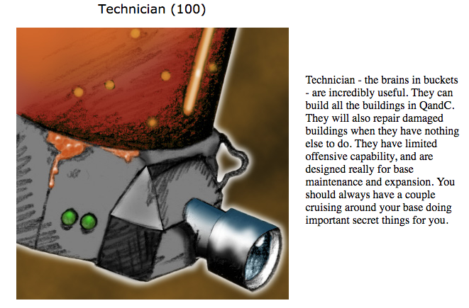 Now you’ve got the basics, there are some more advanced things you can do. Firstly, there are some extra things you can do with unit control. If you hold down the shift key (or whatever key you have bound to +use) when you select units, you will not just select one, but will add units to a selection group. You can also assign these groups to keys (the numbers 0 to 9). To assign to a key, have a/some unit(s) selected, hold down the shift key, and press a number between 0 and 9. You should get a confirmation message. Now, without holding the shift key, you can press the number you assigned to re-select those units. Another modifier to unit behaviour is the force attack command. If you hold down the control key (or whatever key is bound to +attack) and click on the ground or other entity, the selected units will attack that location/thing. You can’t force attack on your own units however. That just wouldn’t be nice. The final modifier to unit behaviour is the stand ground command. If you have a key bound to standground (no default, but you can bind your own), you can use that command to make selected units not move, but attack from where they are. Pressing again will get selected units moving again. If you somehow get units stuck somewhere, or just want to get rid of them, you can use the destruct command. This will instantly kill any selected units. As a tip, don’t bind this to any key you might bump accidently. The final advanced command is the setendpoint command (default key is g). If you have a machine selected, using this command will set the rally point (shown by a flag) of that machine to where you are pointing. With all that knowledge, you’ve earned your QandC licence. From here, the best thing is to play with building all the machines and units, and more importantly playing some games against other people.