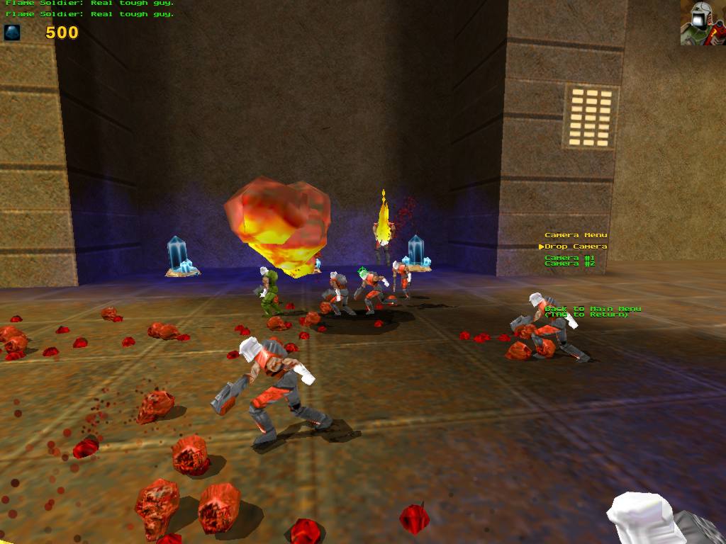 As was hinted in the introduction, you should approach Quake & Conquer a bit differently from other RTS games. The first big change you will notice is that your viewpoint is a floating camera. You can zoom freely around the level, though you’ll notice that you can’t travel through solid surfaces. If you find yourself stuck, just try angling away from the surface you are facing. Now take a moment to revel in this new found freedom. You should notice a menu on the right hand side of the screen. This menu is the first thing that you will get every time you enter a QandC level. As you may have guessed, it is asking you to pick a colour. This colour will appear on all the units you build. You can’t choose a colour that someone else already has. If someone already has a colour, it won’t be shown on the menu. Use the mouse scroll wheel (or the [ and ]) keys to move between entries. Use the middle mouse button (or the enter key) to select an option. Upon selecting a colour, you’ll be transported to a starting spot with a starting unit. The basic interface of QandC is fairly straight forward. Aside from a few exceptions (essential for enforcing the rule), actions consist of clicking with the crosshair. The crosshair is fairly important, and you can experience several fruity flavours using the crosshair command. (Press ‘~’, followed by typing “crosshair X”, where X is a number between 1 and 3)