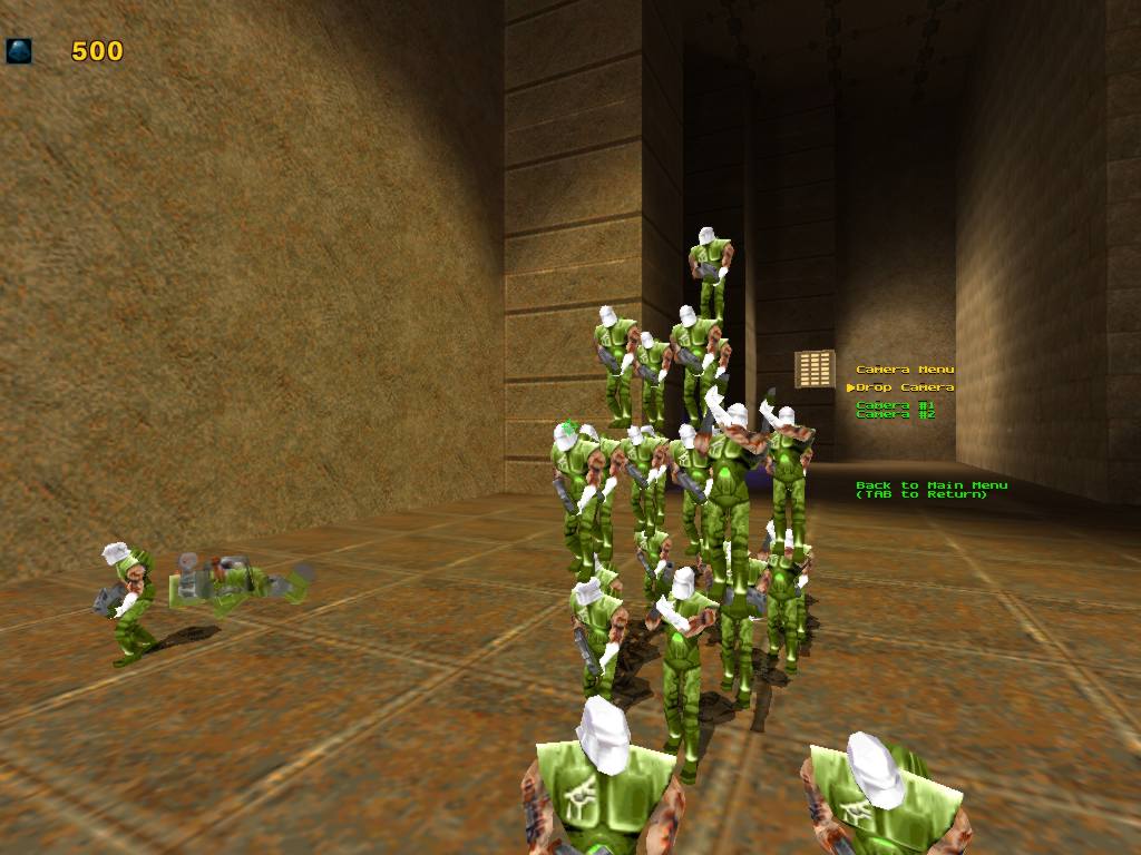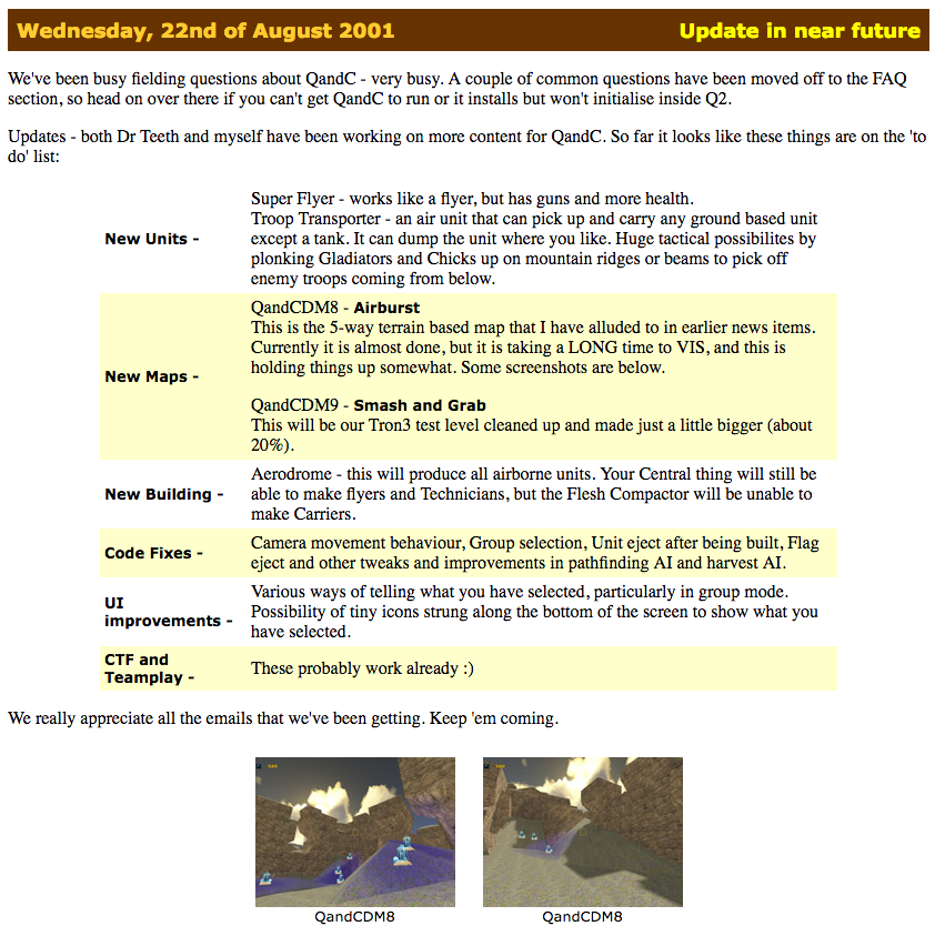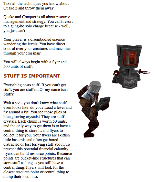 Firstly, thanks to you for taking the time to download/ leech/ beg/ borrow/ steal this mod. It’s been an experience creating it, and we’d hope that others have as much fun with it as we have. Quake & Conquer is (knowing the stigma attached to the cliche) unique. We do mean this. QandC is a real-time strategy (RTS) game using the Quake 2 engine. What makes it more interesting (aside from anyone wanting to see an engine made to do unintended things) is that QandC is truly three dimensional. Whereas many RTS games are essentially a flat plane with obstacles, QandC utilises the 3D qualities of a first person engine to provide a neat experience. Other players could come from any direction, including up and down. It’s quite feasible to find two opposing forces sandwiched on top of each other (sort of like a layer cake, only messier).