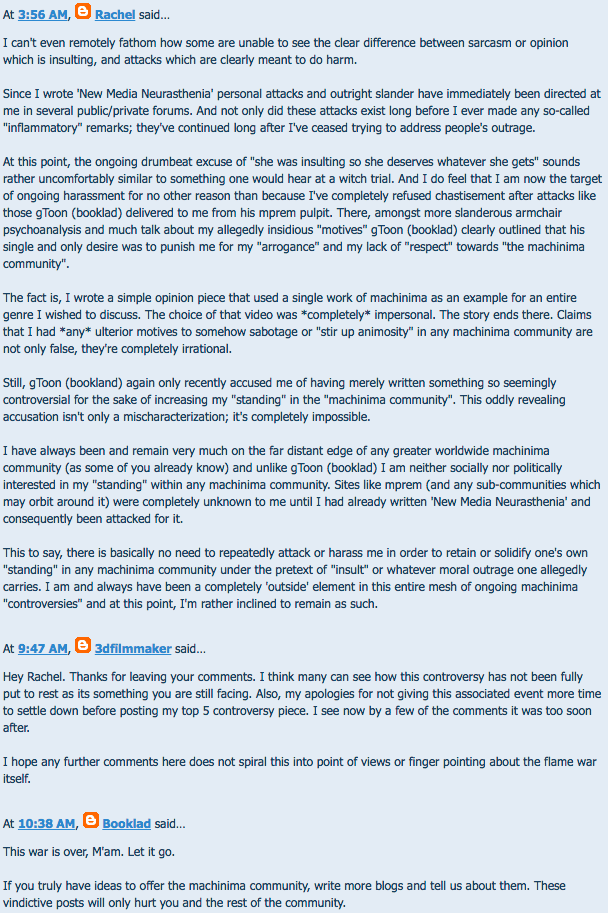 So this is why I list this as controversy number 5 in machinima. Not so much for the volume of discussion on the topic, but because the discussion speaks volumes to where machinima may be headed.