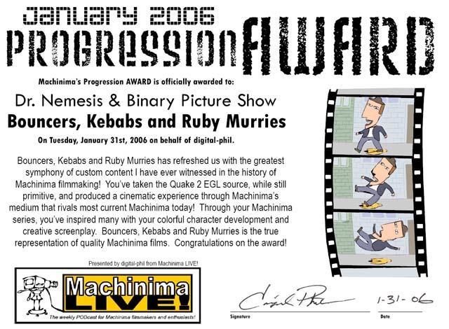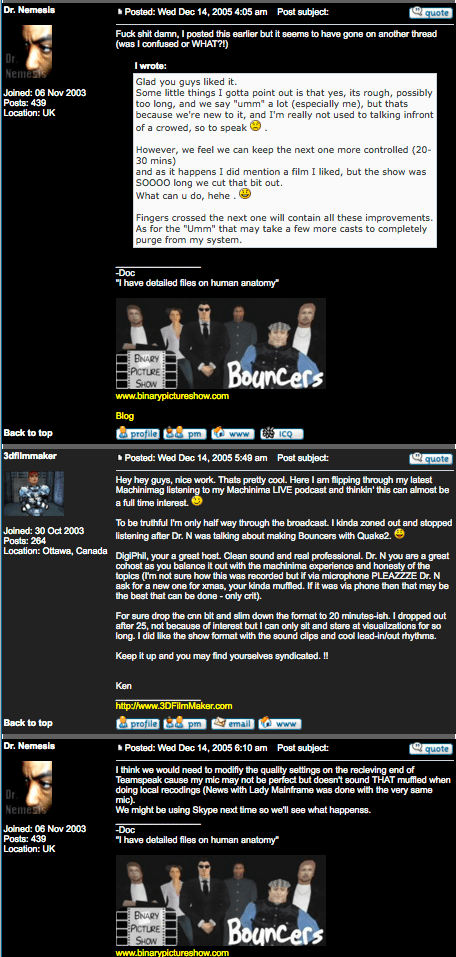 Machinima LIVE! is a podcast from 2005 / 2006 produced by digital Phil and Doc Nemesis, with content such as: The art of Machinima and its evolution. Why produce machinima? Machinima production. Point of View discussion – The good, bad and ugly. Machinima reviews. Interview with Machinima producers. Dr. Nemesis talks about his Machinima experience and Bouncer episodes. Relevant Machinima news and tidbits from around the world. Progressive-House music taken from ACIDplanet. Surprises along the way!