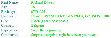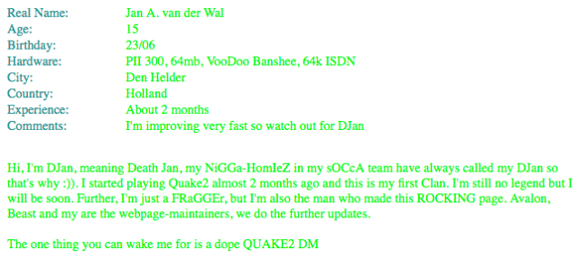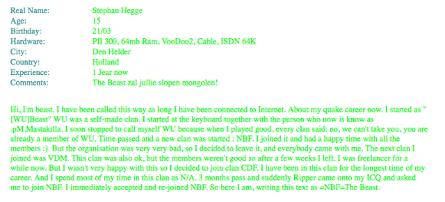 It all started with Quake, I found it on some cd and I really liked it’s style, shooting around with lot of blood…One day I read an article about the happyness of playing games on the internet, then I bought my 28k8 en started playing and it was really cool and I was quite good at it too :) But unfortunely I hadn’t the right system for it, because almost everyone had a 3dfx card.. and I was playing like a blind dildo on a p90, 16 mb, 1mb svga card :(…And my good friend Bastard was alwas watching me, but he hadn’t internet.. I let him play couple of times and I saw he really liked it..