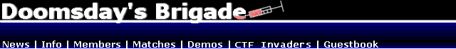 Doomsday’s Brigade (shortly DdB) is a Quake 2 Capture The Flag clan. If you want to know more about us, go to the Info page. This homesite is done with screen resolution of 1024×768 and it should work with Internet Explorer and Netscape. If you face any problems while surfing this site feel free to mail kotti and we’ll see what we can do… This site is designed mostly by Padishar and NiteGod. Cool logo and intro made by Mercury. Well what are you waiting for anymore? Go and enjoy surfing this site.
