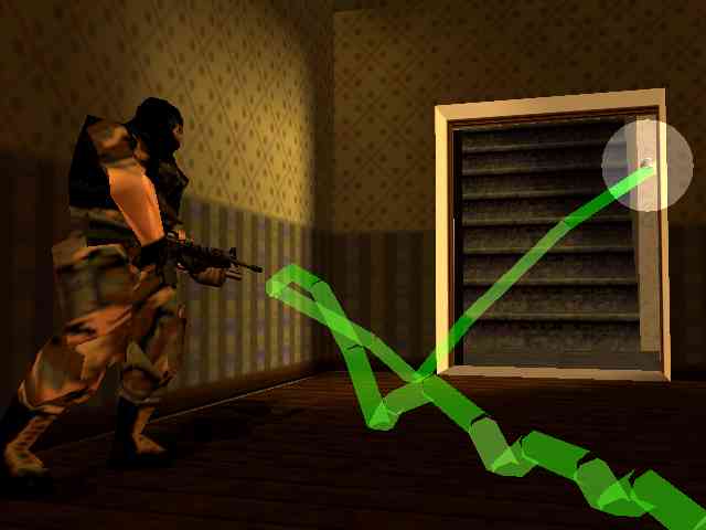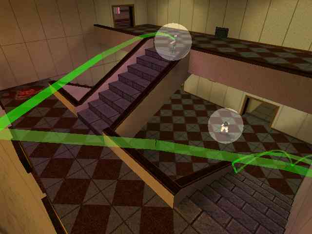 A significant part of the CGF code is dedicated to tactical terrain understanding. Bots have a good hunch for the better tactical positions. They often prefer a safer route “under cover” over the shortest path, and are able to do a stealthy approach by hugging the walls and using shadows. They understand that the position just around the corner can provide them cover, and make intelligent guesses where threats might show up. (See illustrations above).