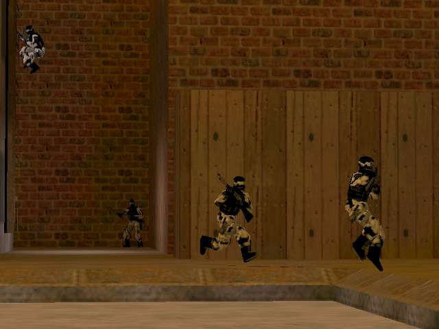 The feel of ActionQ2 team play therefor is difficult to approach. However, the CGF bots try hard. They run around with co-ordinated team tactics in mind. They try to stay in touch with team buddies, warn each other, assist each other by watching for threats and employing suppression fire. When the situation calls for it, the bots will use bounding overwatch advance and pullback maneuvers.