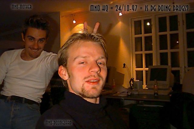 Her er et billede af helten, hvis du ikke allerede HAR set det. MnO-Mother, som kan ses i baggrunden i færd med at provokere mig, HAR faktisk ikke kanintænder, selv om det ser sådan ud på dette thumbnail picture. Efter jeg havde takket ham for hans V fingre, havde han faktisk slet ingen tænder. PS. jeg var på LSD da billedet blev taget.