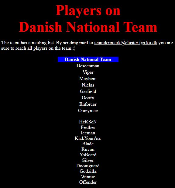 May 14, 1997 – Welcome to the Danish National Team‘s new home and thanx for Doomguard for making it possible :) As you may know we have played our first fight against Sweden 11. may which was the main reason for this team was made and we are now ready to face new challenges to defend our nation’s pride :)