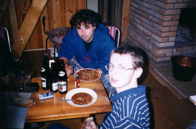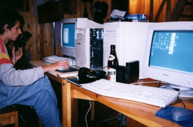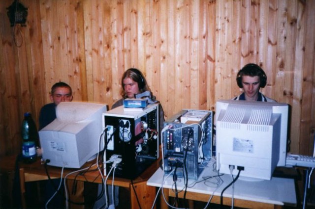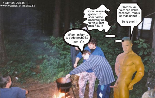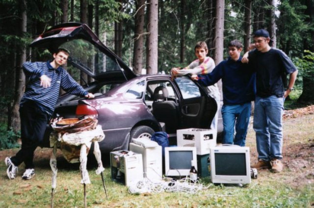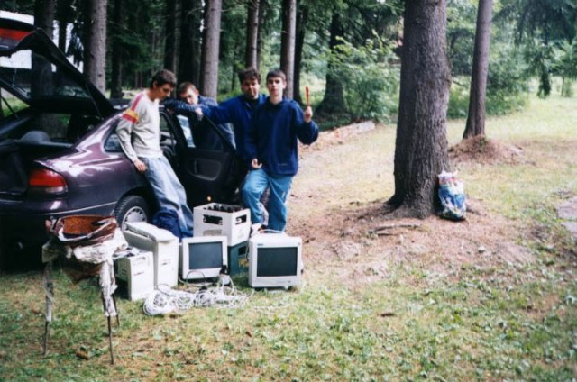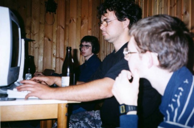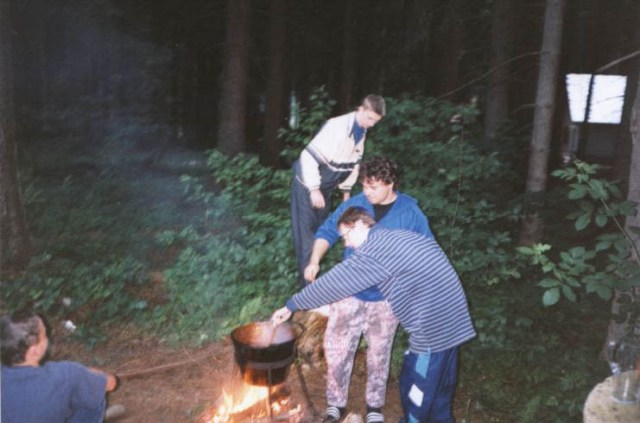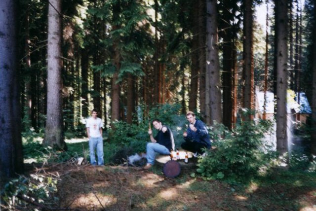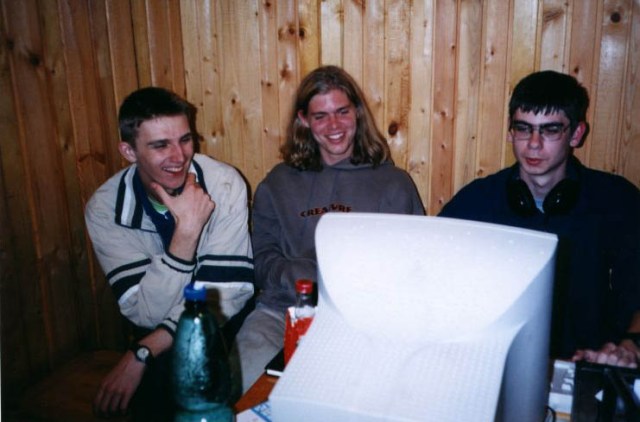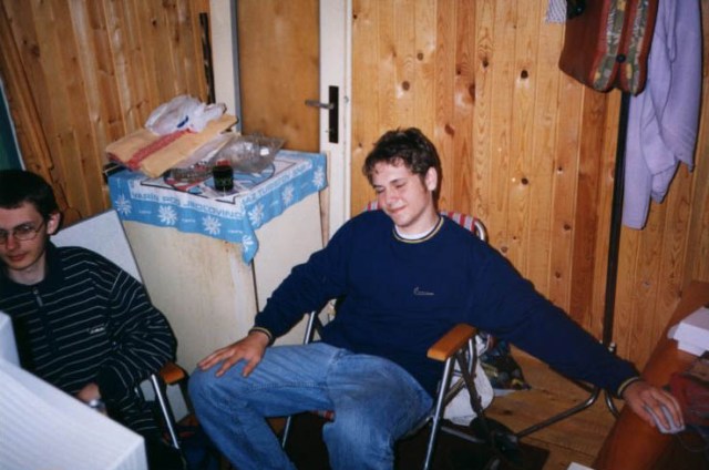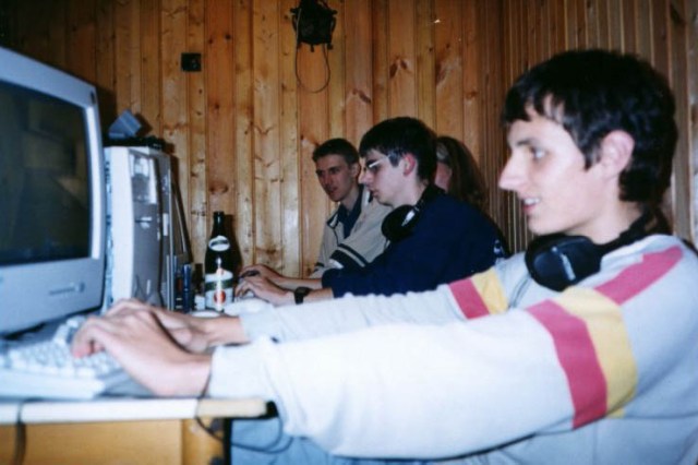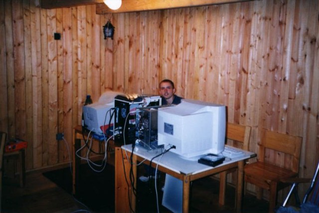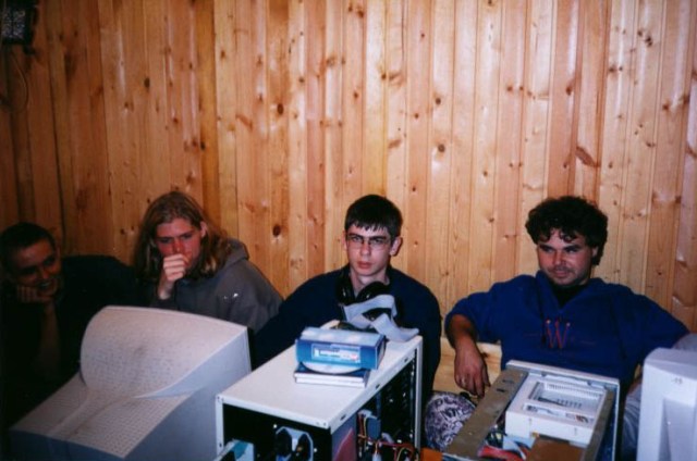 Phobos zišiel z cesty a zaparkoval tesne pred chatou (a stromom :-)), všetky veci sa nahádzali do chaty, pivá sme naložili do chladničky, pripravili sa stoly pre mašiny a mohlo sa ísť rozchádzať počítače. Toš ja som si kvôli svini Ebovi našiel novú lásku na prvý pohľad, a síce Logitech Wingmana… fakt rulez myš, ropucha boomslang sa nechytá. Tak sme začali inštalovať Phobosovu mašinu, ktorý ju mal totálne rozj… Po rôznych komplikovaných čachroch s hardiskami sme tam rozchodili SEC. EDIT. wokna, sieť fičala, do môjho kompu sa hodila Riva TNT a nejaká ta RAMka a HDD od Gamera a mohlo sa začať kopčiť. Keď sme prišli, svedomitý Ebola s Johnym a s ostatnými už mali našúpanú cibuľu. No a zatiaľ čo ja som sa sral s počítačmi, Phobos začal organizovať práce na guláši. Proste úplná komunistická deľba práce. So Zeusovou Rivou boli menšie problémy, sa hriala jak sviňa, veď ju vraj nejakú zlacnenú kúpil… dokonca aj s prídavným chladičom (kua Zeus nabúce tú Rivu nekupuj v zelovoci, ale v obchode s kompíkmi), tak sa to muselo dať zas naspäť… proste tradičné hardwarové problémy. Chalani ponosili drevo, oheň sa rozhorel, ja som pomaly dorábal kompík, niečo sme poopekali, Phobosva mašina sa rozfachala, opiekol som si slaninku, a potom sme s Johnym začali paritť. Kým sme šli na chatu ešte posledný raz zapršalo, ale akonáhle sa tam objavil boss Wepman, lamerské oblaky sa vysrali na to a už nepúšťali žiaden dážď, tak sa mohol začať variť aj gulášik. To sme prenechali Phobosovi, a ostatní sme si vzájomne nakopírovali čo sa dalo, Zeus s Gamerom mali vlastné disky s kopou zaujímavostí (napr. duracell.mpeg, či nadržaná fena.mpeg, atď… :-) ). Zeus sa stal betatesterom Diabla II, tak sme si ho od neho samozrejme všetci skopli :-) ale mne sa kua nejako stratilo z disku (ty špina Gamer že si dal namiesto copy move?)… ale čo už aj tak by sme to zrovna moc po nete nehrali. Popri tom sme zapíjali pivká jedno za druhým… Radegast rulez :-) Úplná pohodička. Len Johny bol trocha nervózny, sa bál, že niečo vyvedieme :-)