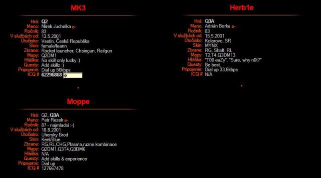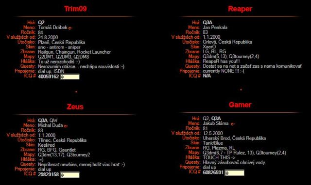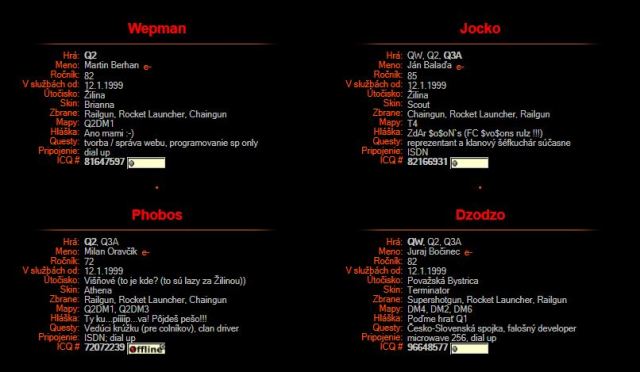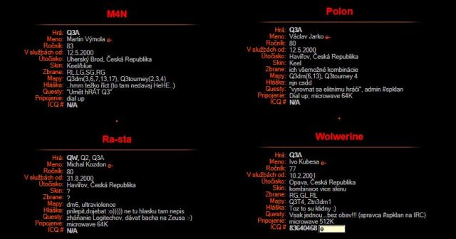 Zo slovenských účastníkov sa zúčastnili Jocko, Phobos, Johny, Wepman a ja (Dzodzo (?)). Jocko – no predsa Jocko, ten zmrd čo bol na QH 99 celkovo štvrtý v Q2. Phobos – klasický príklad lamera čo ani nevie navariť guláš :) Ale aby som len nehanil, boli vidno náznaky tréningu s railom (a to o tom guláši vravel Wepman). strong>Johny – aj keď to ešte stále nie je ono, chlapec cvičí. Wepman – nechcel jesť miestnu väzenskú stravu (si si mal korienky v lese natrhať fajnovkár!!! :) a hral ako vždy (tzn. neuznáva kemperov, ale kempoval, neuznáva rakety do výťahu – púšťal granáty, neuznáva výhovorky pri prehre, ale vyhováral sa atď :) Dzodzo – jednoznačný šampión (he-he), ktorý by momentálne, keď trénoval iba Q1 skončil na poslednom mieste z celého klanu. Však, ale… nejde o tooo… Gamere… kurva se neříká! Pekne voní tá tvoja slivovica!…