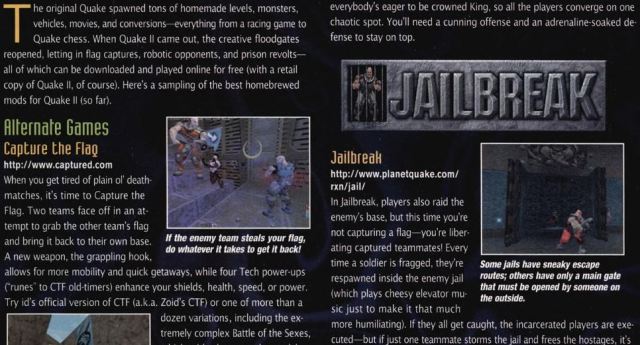 As amateur programmers create their own modifications, everybody’s eager to be crowned King, so all the players converge on one chaotic spot. You’ll need a cunning offense and an adrenaline-soaked defense to stay on top. The original Quake spawned tons of homemade levels, monsters, vehicles, movies, and conversions— everything from a racing game to Quake chess. When Quake II came out, the creative floodgates reopened, letting in flag captures, robotic opponents, and prison revolts— all of which can be downloaded and played online for free (with a retail copy of Quake II, of course). Here’s a sampling of the best homebrewed mods for Quake II (so far).