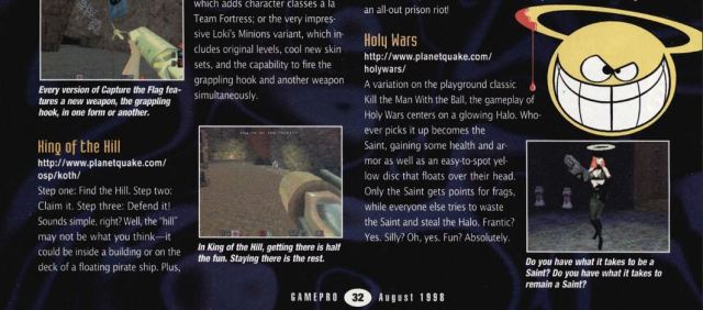 A variation on the playground classic Kill the Man With the Ball, the gameplay of Holy Wars centers on a glowing Halo. Whoever picks it up becomes the Saint, gaining some health and armor as well as an easy-to-spot yellow disc that floats over their head. Only the Saint gets points for frags, while everyone else tries to waste the Saint and steal the Halo. Frantic? Yes. Silly? Oh, yes. Fun? Absolutely. Every version of Capture the Flag features a new weapon, the grappling hook, in one form or another.