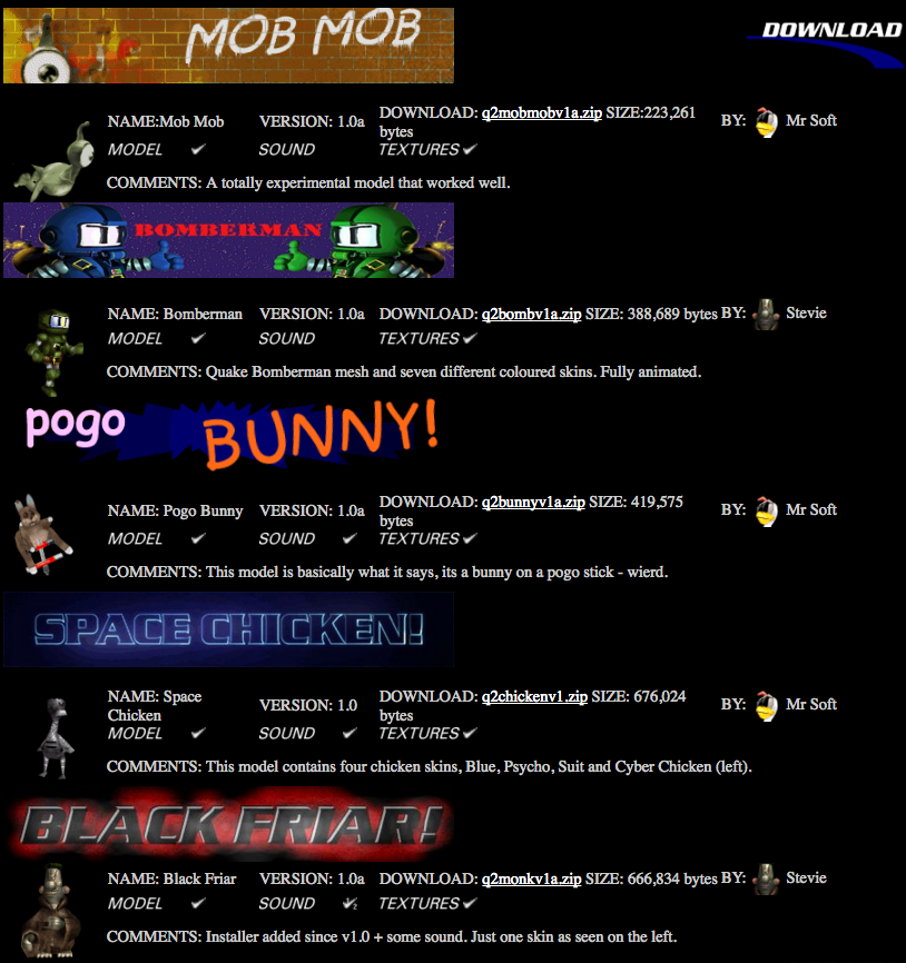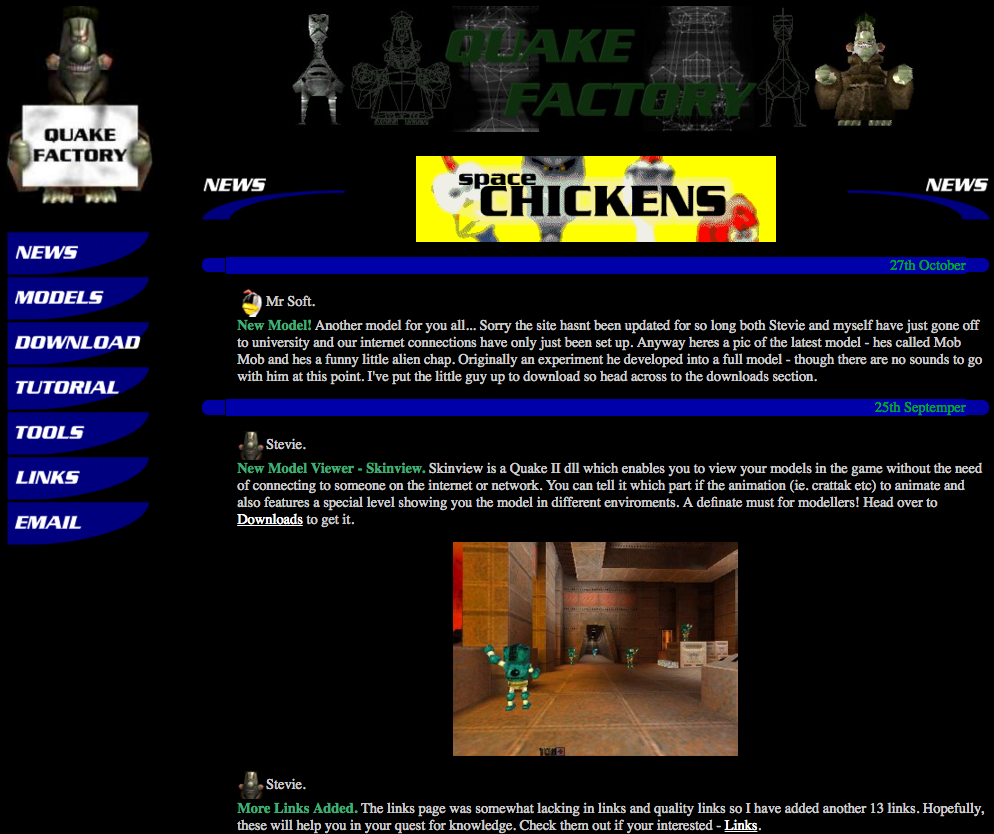 August 8, 1999… Launch of the Quake Factory! We are two brothers (Stevie and Mr. Soft) who are 3D modelers and texturers. We have only done two Quake II models so far, but intend to produce more.