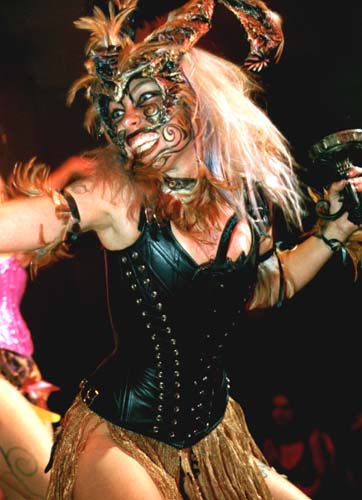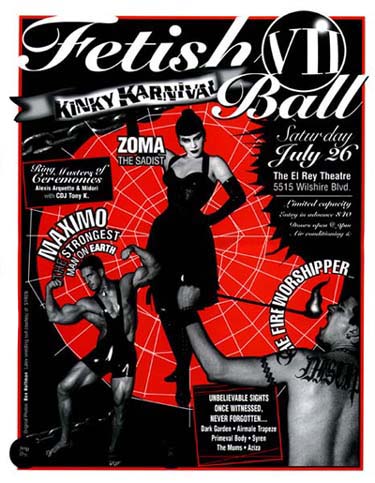 On July 26th 1997, ESP presented it’s Seventh Annual Fetish Ball at The El Rey Theater in the historic Miracle Mile District of Los Angeles. This years ball was themed for the first time. The theme Kinky Karnival, was a tremendous success. Although this year’s venue was smaller and accommodated less people, the organizers were able to regain the purity of the event. A strict dress code and the theme of the party provided for some truly titillating and creative costumes.