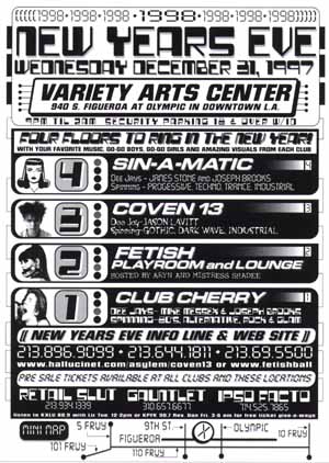 The Fetish Ball began in 1991 when ESP threw a Halloween party at the Probe. It was fantastic with 900 people attending. That success enticed us to begin an annual tradition. The 2nd & 3rd parties were held in July and were called the Ball Bizarre. To add to the elegance of the event, we moved to the Park Plaza Hotel. In 1994, we changed the name to the FETISH BALL. Each year the response has compounded, with 1995 surpassing all previous years. 1,700 people savored the experience. Then in 1996 we felt compelled to increase the splendor by presenting the Fetish Ball in the lavish and exquisite surroundings of the Variety Arts Center. Our continued participation in the scene has rewarded us greatly with quality entertainment, cutting edge designers and resplendently bedecked patrons.