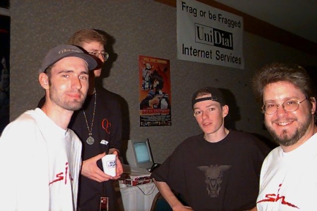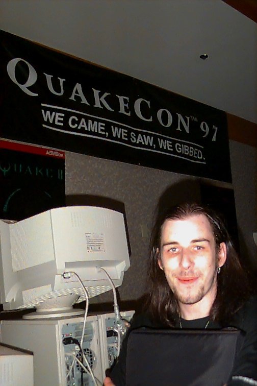 -Sunday, I finally played a little bit of Quake in a ffa going on. The mouse I was using wasn’t letting me rocket jump very well, but it was fairly playable. A little bit after that, I had to leave because that’s when my ride was going. Unfortunately, the celebrity tourney was pushed back to Sunday and then cancelled I was really nice to have met so many people face to face for the first time. Now I can hear their voices and see their faces when they talk online. I was sad that I didn’t get to meet everybody I wanted to though. I didn’t even know Darin McNeil (Quake will rule the cosmos) was there and never ran into Heath Fowler (Mr. Wolf’s Quake Den). I only got to talk to Process for a couple of minutes too (only time I saw him). Oh well, maybe at the next Quake convention.
