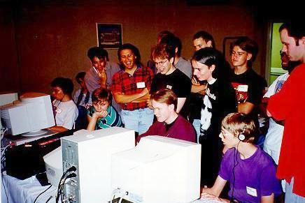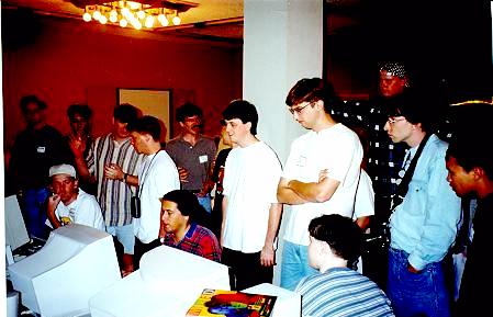 People standing around watching John Romero kick butt at DM (note John Cash in the gray polo).
