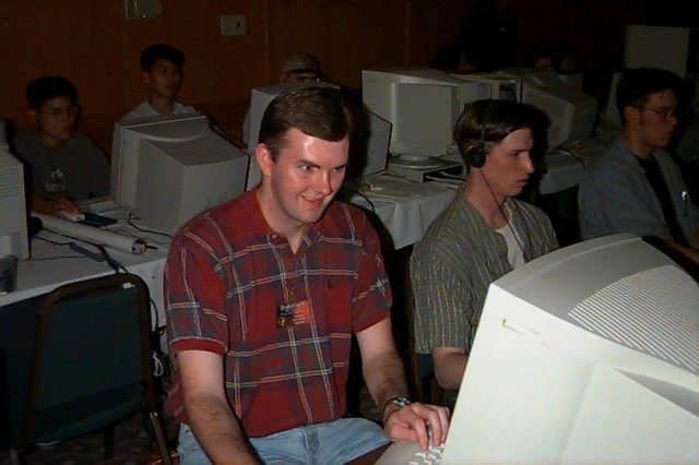 John Cash was often in attendance. He even brought his 6 year old son Johnny on Saturday. It turns out Johnny is a fairly good Quake player. He even beat poor Esses one on one and I hear he won in a four player game. I got to watch him play Hexen 2 a little bit. John commented that it was a little different than the one he’d played before. I wonder if the kid is under NDA. Hehe.