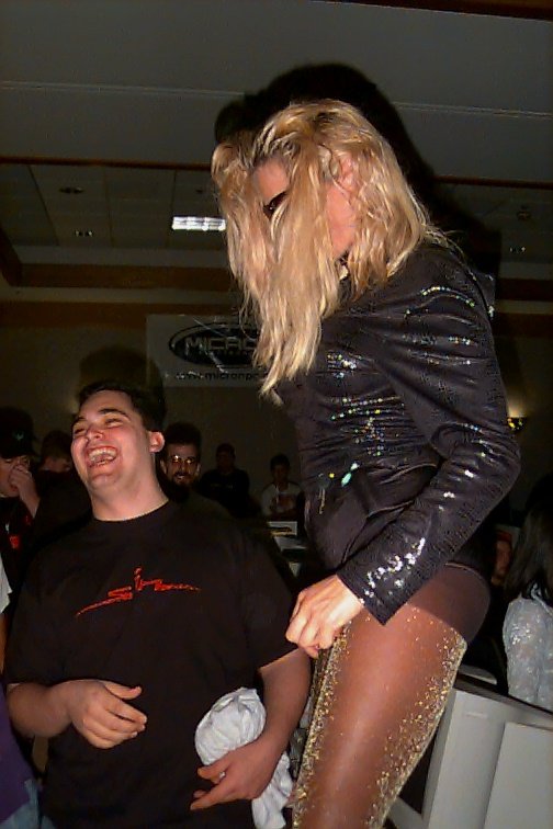 Saturday afternoon was when the ‘SiN girl’ showed up to give out SiN t-shirts. I was over watching somebody deathmatch and saw Jack Mathews dancing without a shirt on out of the corner of my eye about 15 feet from me. I had to investigate (as any good news person would do). I went up and asked her if I could have a shirt. She said I had to do something for it. So I asked her what she wanted me to do. She told me to give her my belt and I obliged. Then she told me to get down on my hands and knees. As people started chanting my nick several times, she spanked me. Then I got up and grabbed the shirt. Not only did I not have to pay for it, but she gave ME something. Where else could this happen but Quakecon? :) See the picture below to get the visual image in your head (Jack ‘morbid’ Mathews in the background):