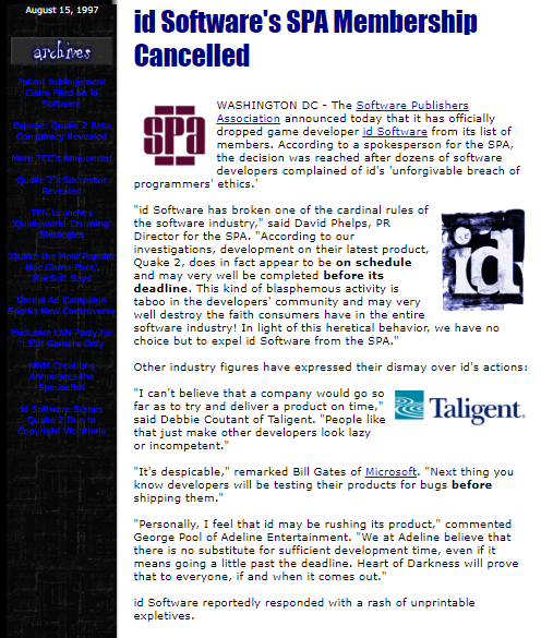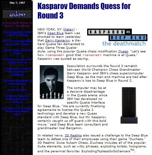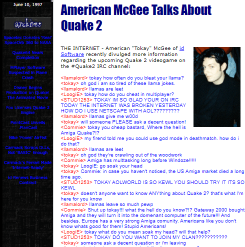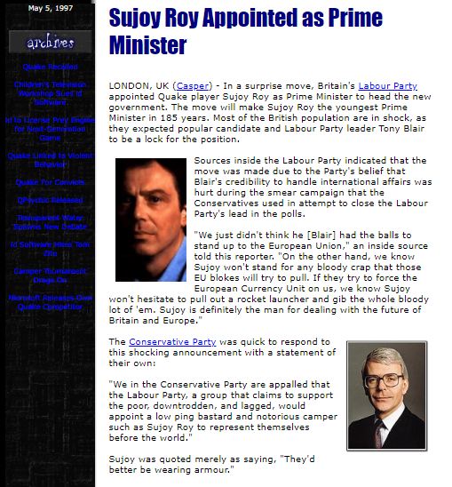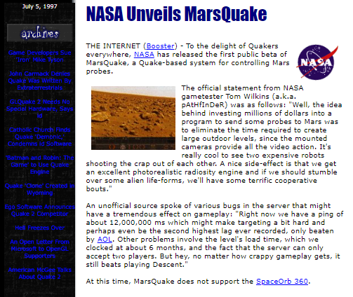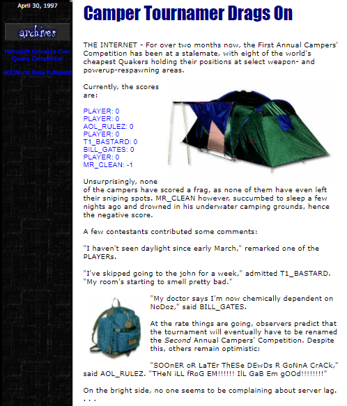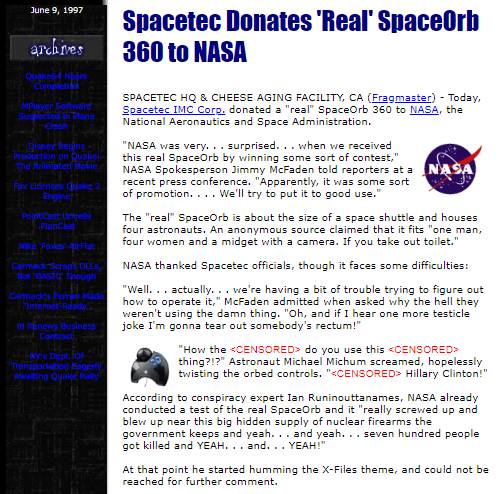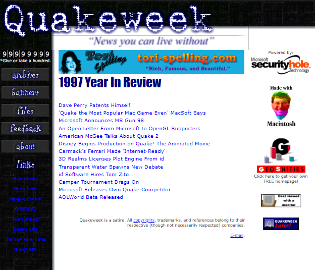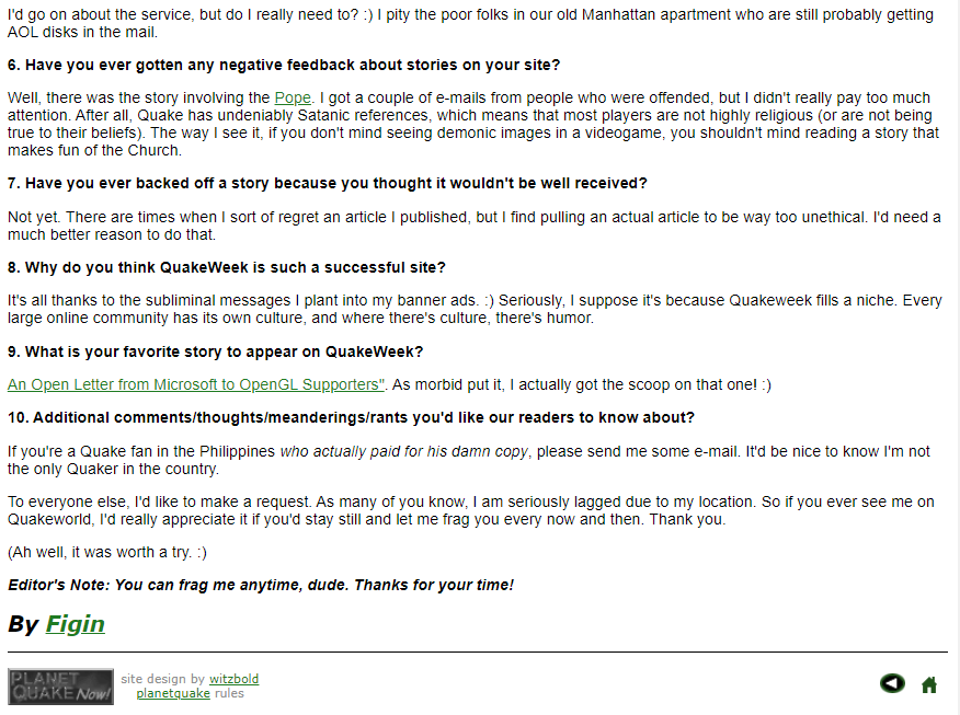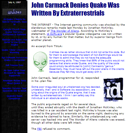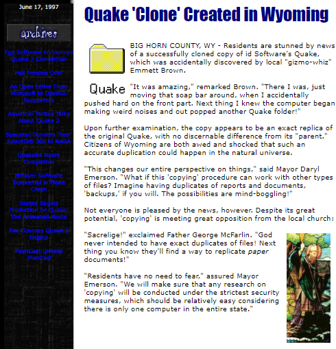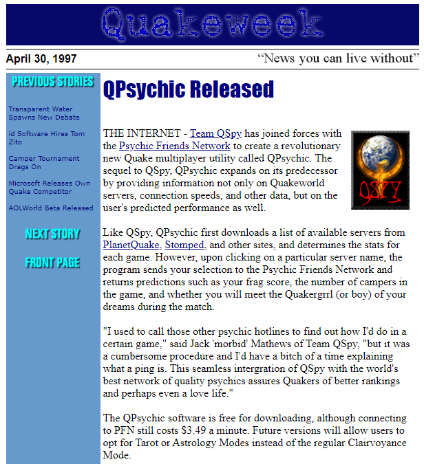 “Quakeweek, by spRocket (aka Miguel Tenazas, age 18, Manila, Philippines,) was born on April 30, 1997, put up on Geocities to serve as a temporary page for Kevin ‘Fragmaster’ Bowen’s The New Vore Times, which went ‘On Hiatus’ in mid-April of the same year. As time passed, Frags took on more responsibilities for PlanetQuake and eventually decided to shut down NVT for good, making Quakeweek its unofficial successor. Qweek moved to PlanetQuake on June 11th, and the rest is history. It is interesting to note that NVT was also once a temporary page for Sujoy’s Quake Pages, which was the original fake news site for the Quake community. Quakeweek officially shut down on October 15, 1997.”