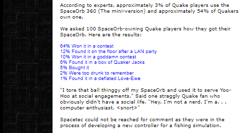“Hello Quake Fans, Figin here. I decided to put on my Geraldo Rivera cap and do some serious investigative reporting. I searched high and low for all the dirt on this dude known as spRocket who runs a page called QuakeWeek, which is a satirical look at all things Quakish. So after rumaging all over the net and not finding a damned bit of proof that he really even exists, I mailed him for the scoop. He was kind enough to answer a few questions. Seriously, this guy is one of the nicest and most funny guys I’ve ever seen online. His site is pure genius (I’ve always gotten off on satire, myself) and was glad that he took the time to speak to me. If you haven’t read his stuff before, go over there right now! Or at least wait until you’ve read the interview :) Enjoy!!”